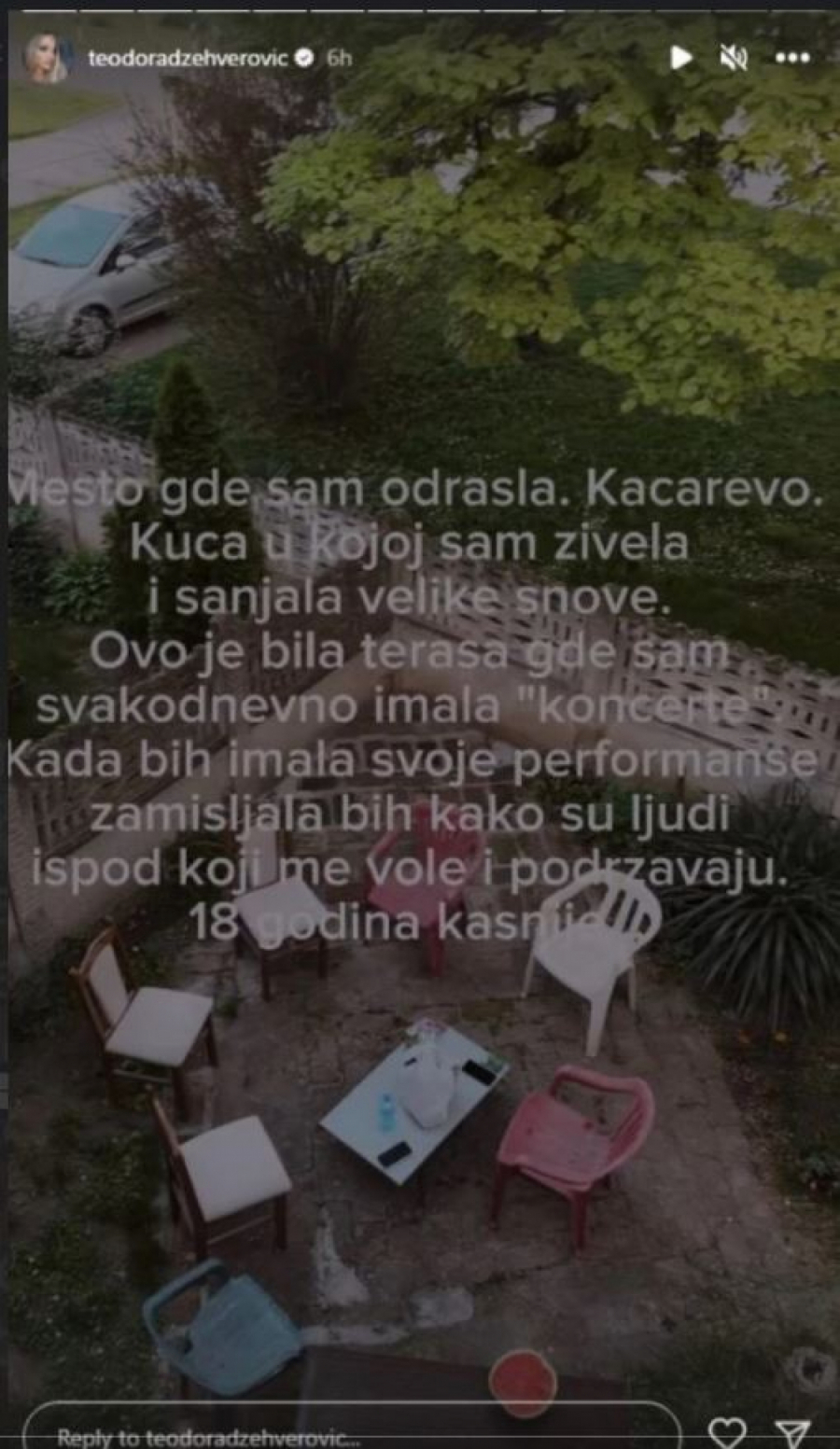 - Mesto gde sam odrasla. Kačarevo. Kuća u kojoj sam živela i sanjala velike snove. Ovo je bila terasa gde sam svakodnevno imala "koncerte". Kada bih imala svoje performanse zamišljala bih kako su ljudi ispod koji me vole i podržavaju - napisala je Teodora na Instagramu.