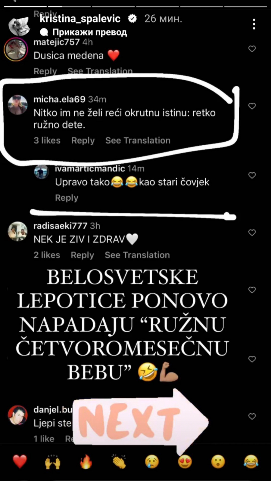 - Plaki- napisala je ona ironično na svom Instagram profilu, pa pokazala sve osobe koje su učestvovale u ovako sramotnim komentarima nazivajući malo dete pogrdnim imenima.