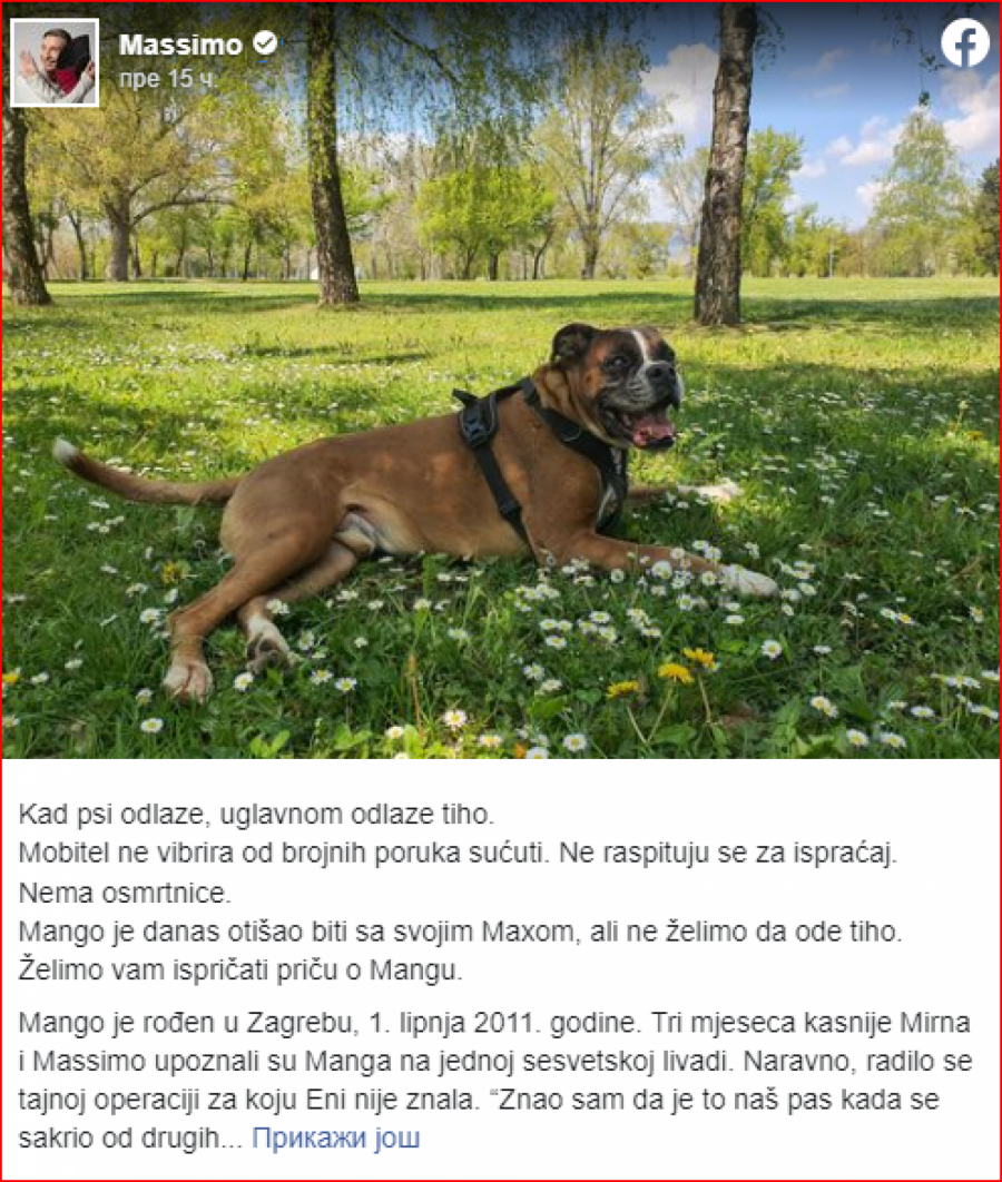 Porodica Masima Savića objavila je na društvenim mrežama da je njihov pas Mango uginuo.