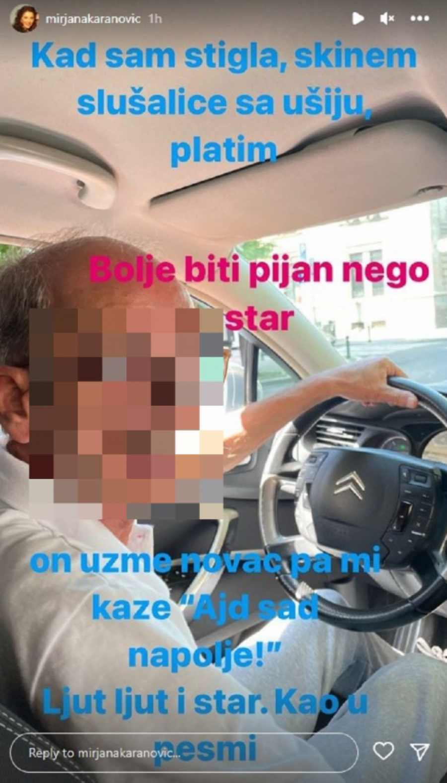 - Kad sam stigla, skinem slušalice sa ušiju, platim, on uzme novac, pa mi kaže, "Ajd sad napolje!". Ljut, ljut i star, kao u pesmi - napisala je Karanovićeva.