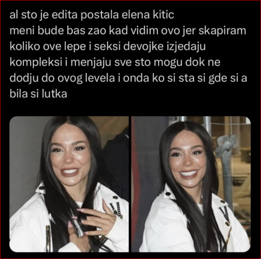 - Ali što je Edita postala Elena Kitić... Meni bude baš žao kad vidim ovo, jer skapiram koliko ove lepe i se*si devojke izjedaju kompleksi i menjaju sve što mogu dok ne dođu do ovog levela. I onda ko si, šta si, gde si? A bila si lutka - porkomentarisao je jedan tviteraš Editinu promenu na licu.