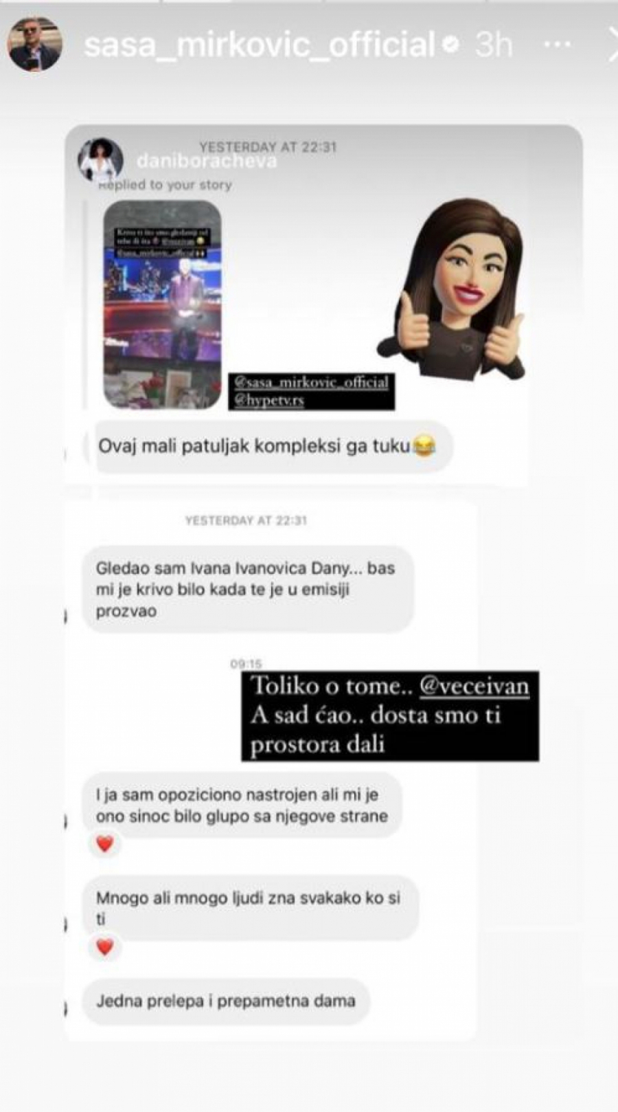 Potom na instagramu je Mirković podelio još jedan Danielin stori u kojem se vidi kako fanovi upućuju reči podrške voditeljima HYPE Televizije, a kritikuju Ivanovića za njegovo nedolično ponašanje.