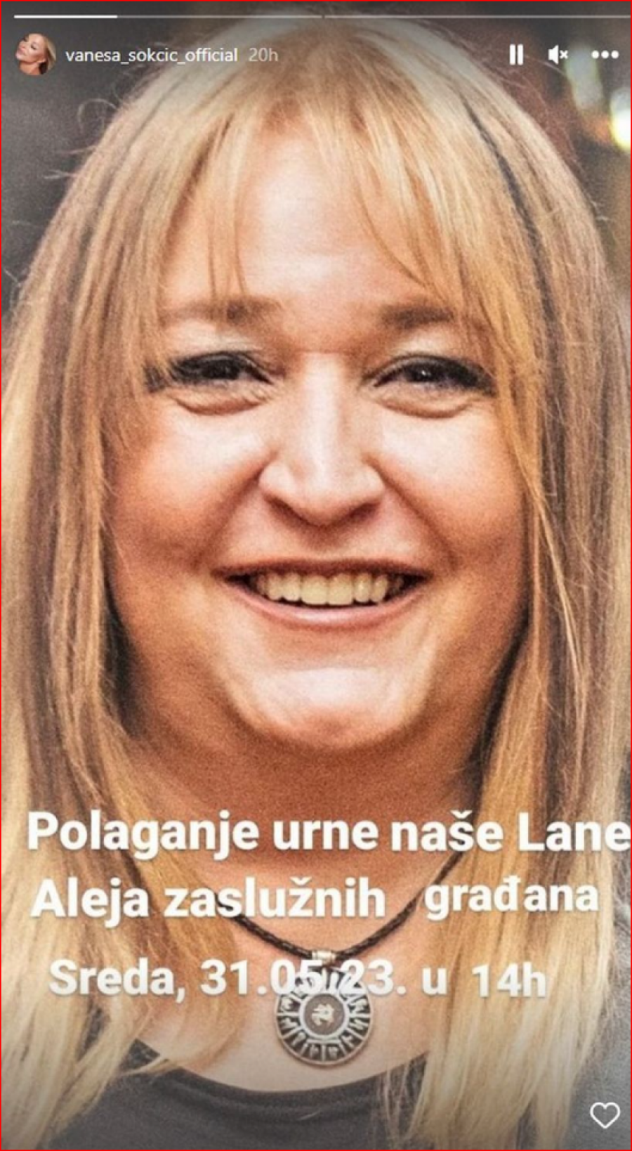 - Polaganje urne naše Lane, Aleja zaslužnih građana, sreda 31.05. u 14 sati - napisala je Vanesa na Instagramu.