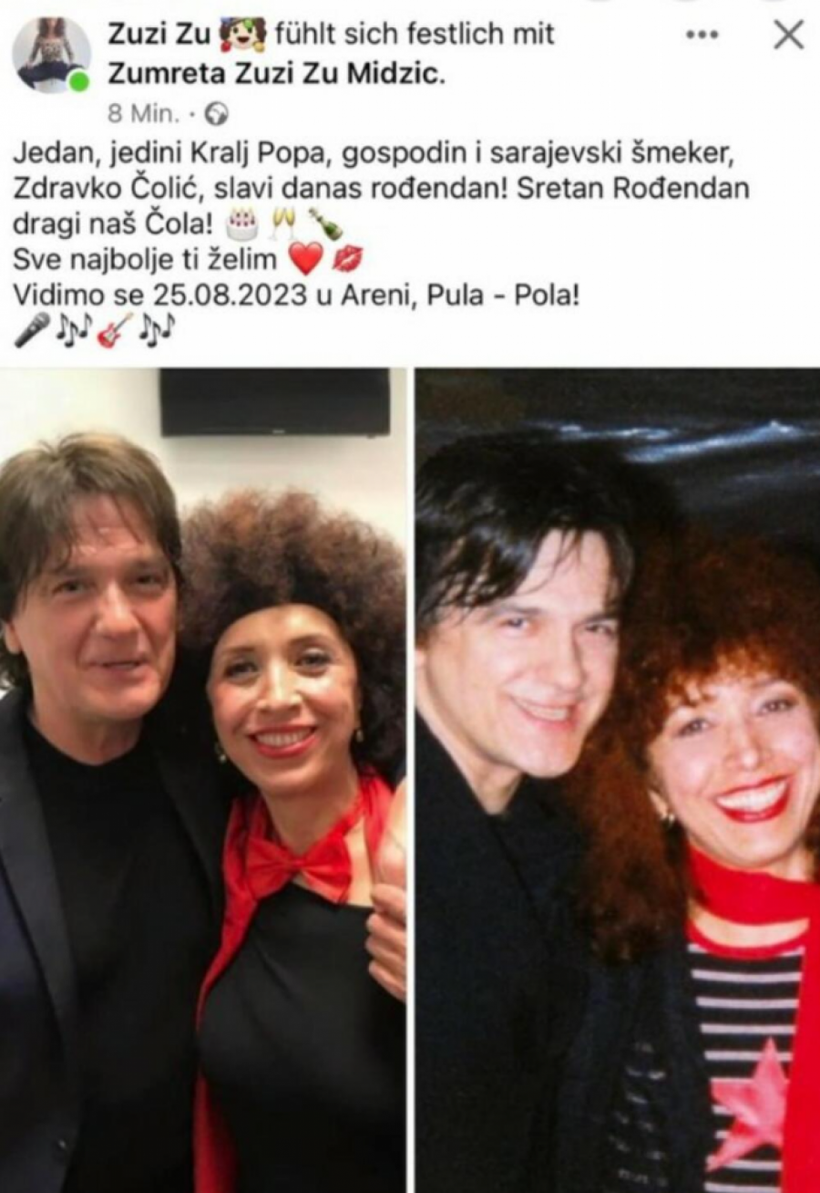- Jedan, jedini Kralj Popa, gospodin i sarajevski šmeker, Zdravko Čolić, slavi danas rođendan! Sretan rođendan, dragi naš Čola! Sve najbolje ti želim - napisala je Zuzi.