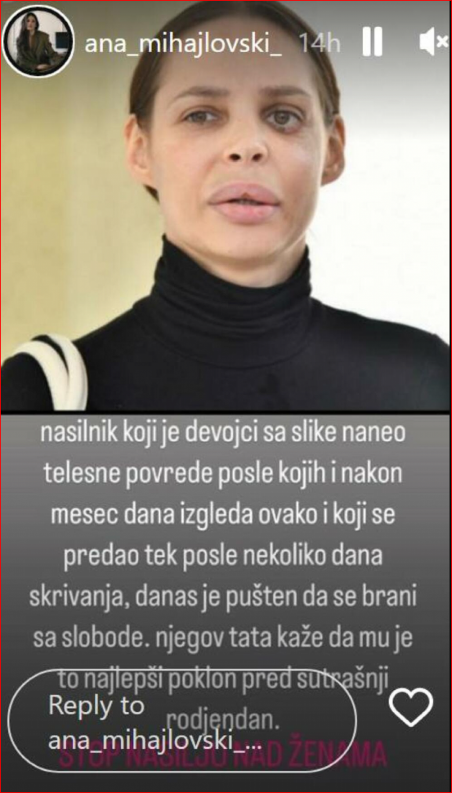 - Nasilnik koji je devojci sa slike naneo telesne povrede posle kojih i nakon mesec dana izgleda ovako i koji se predao tek posle nekoliko dana skrivanja, danas je pušten da se brani sa slobode. Njegov tata kaže da mu je to najlepši poklon pred sutrašnji rođendan. Stop nasilju nad ženama - napisala je Ana.