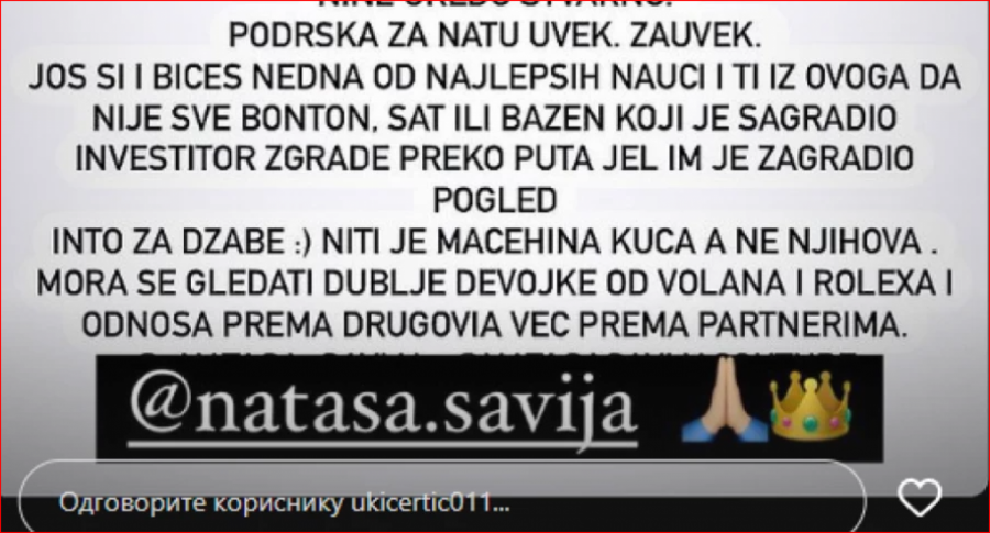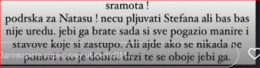 - Podrška za Natašu! Neću pljuvati Stefana, ali ovo baš, baš nije u redu. Sada si pogazio baš sve manire i stavove koje si zastupao. Nisam ovo očekivao od njega. Nataša, nisi zaslužila ni čvrgu, potpisujem. Nju znam sedam godina, a njega pet, sačekao sam da prizna neke stvari i da dobijem pritvor, da bih bio fer prema njemu. Ovo najstrašnije osuđujem, niko to nije zaslužio, naročito neka devojka sa kojom si u vezi/vezici - napisao je Ćertić.