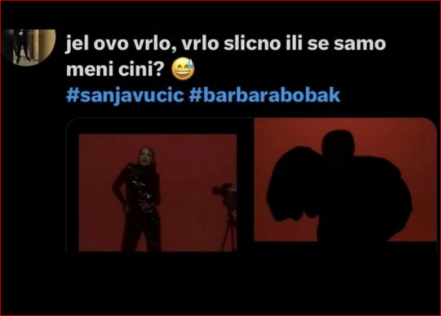 Naime, Barbara je nedavno izbacila pesmu “Pogrešni”, a mnogi smatraju da su kadrovi ova dva spota poprilično slični. Tačnije, isti je kolor – dominira crvena boja, kao i određene scene u kojima su ljudi u "senci".