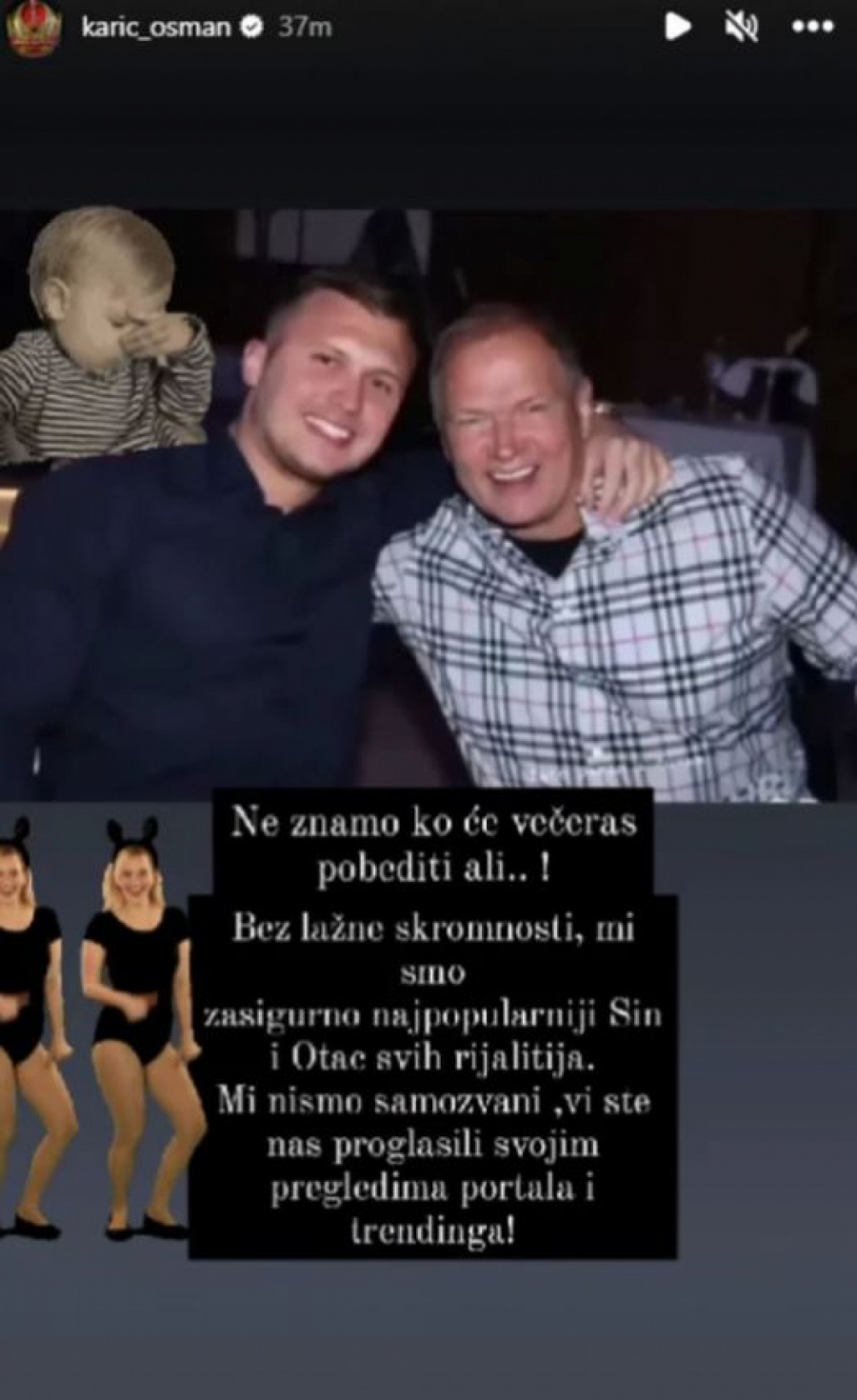 -Ne znamo ko će večeras pobediti, ali bez lažne skromnosti, mi smo zasigurno najpopularniji sin i otac svih rijalitija. Mi nismo samozvani, vi ste nas proglasili svojim pregledima portala i trendinga - napisao je Osman.