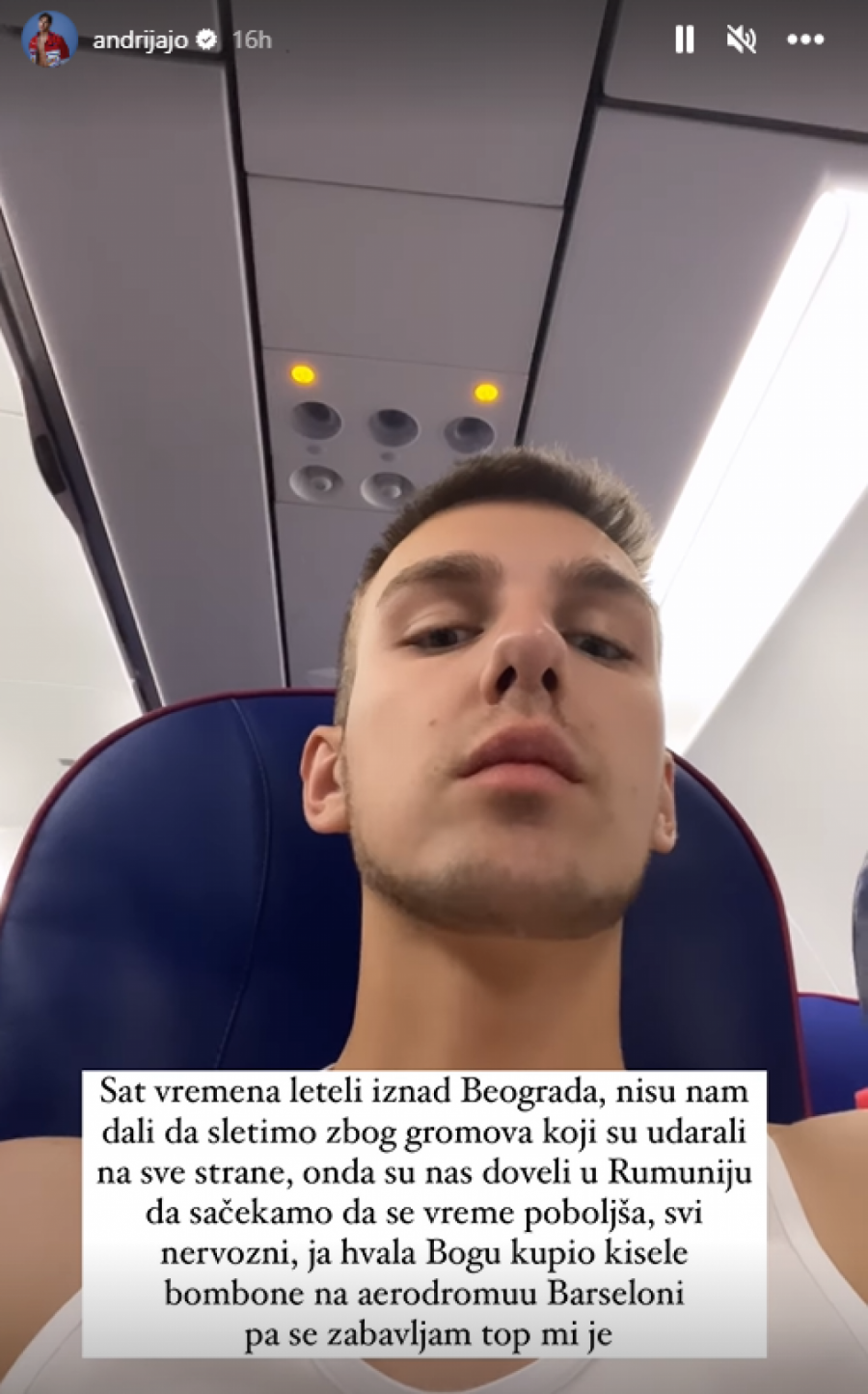 - Sat vremena leteli iznad Beograda, nisu nam dali da sletimo zbog gromova koji su udarali na sve strane. Onda su nas doveli u Rumuniju da sačekamo da se vreme poboljša. Svi nervozni, ja hvala Bogu kupio kisele bombone na aerodromu u Barseloni pa se zabavljam, top mi je - napisao je Andrija.