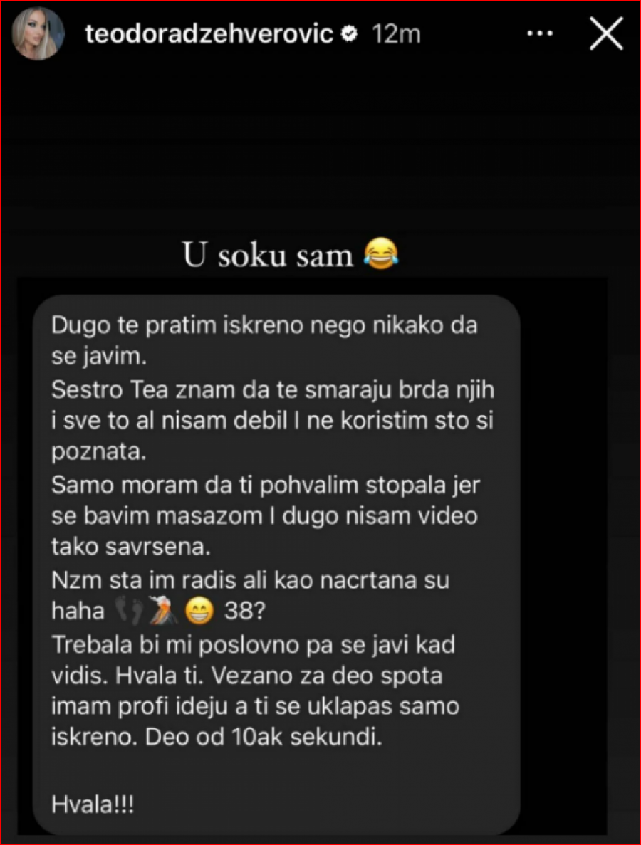- Dugo te pratim iskreno, nego nikako da se javim. Sestro Tea, znam da te smaraju brda njih i sve to, ali nisam debil i ne koristim to što si poznata. Samo moram da ti pohvalim stopala jer se bavim masažom i dugo nisam video tako savršena. Ne znam šta im radiš, ali kao nacrtana su. 38? Trebalo bi mi poslovno, pa se javi kad vidiš. Imam profi ideju, a ti se uklapaš samo - glasi poruka, na šta je Teodora kratko napisala: