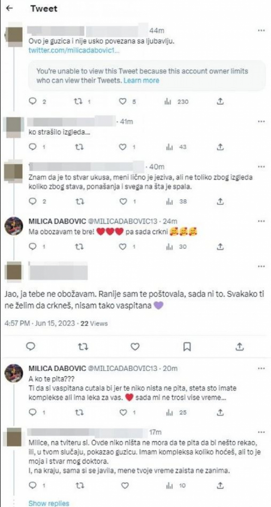 - Milice, na Tviteru si. Ovde niko ništa ne mora da te pita da bi nešto rekao, ili, u tvom slučaju, pokazao gu*icu. Imam kompleksa koliko hoćeš, ali to je moja i stvar mog doktora. I, na kraju, sama si se javila, mene tvoje vreme zaista ne zanima.