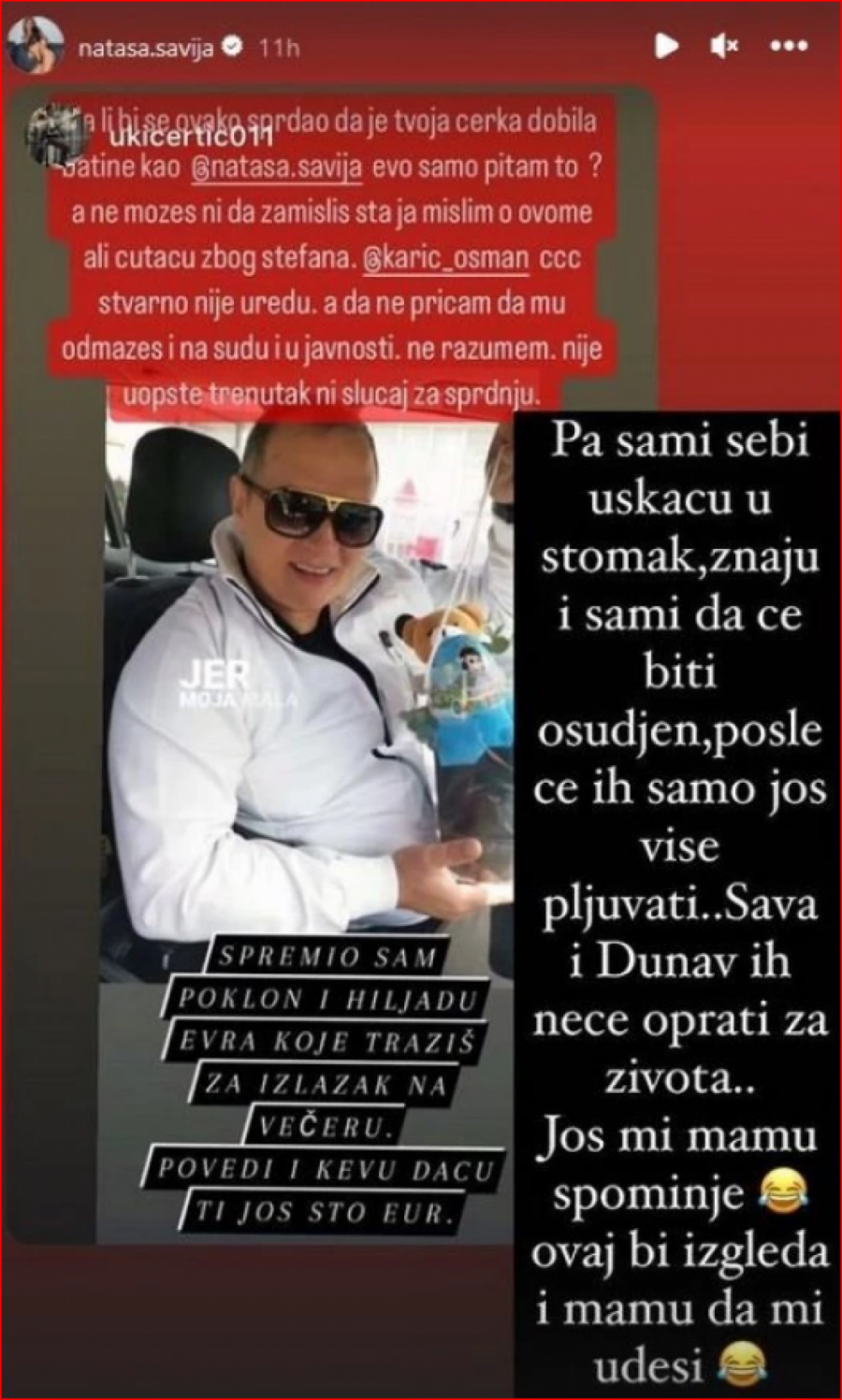 - Spremio sam poklon i hiljau evra koje tražiš za izlazak na večeru. Povedi i kevu, daću ti još sto eura - napisao je Osman na svom storiju uz sliku paketa.- Da li bi se ovako sprdao da je tvoja ćerka dobila batine kao Šavija? A ne možeš ni sam da zamisliš šta ja o ovome mislim, ali ćutaću zbog Stefana. Stvarno nije u redu, a da ne pričam da mu odmažeš i na sudu i u javnosti. Ne razumem, uopšte nije trenutak ni slučaj za sprdnju - napisao je Ćertić.