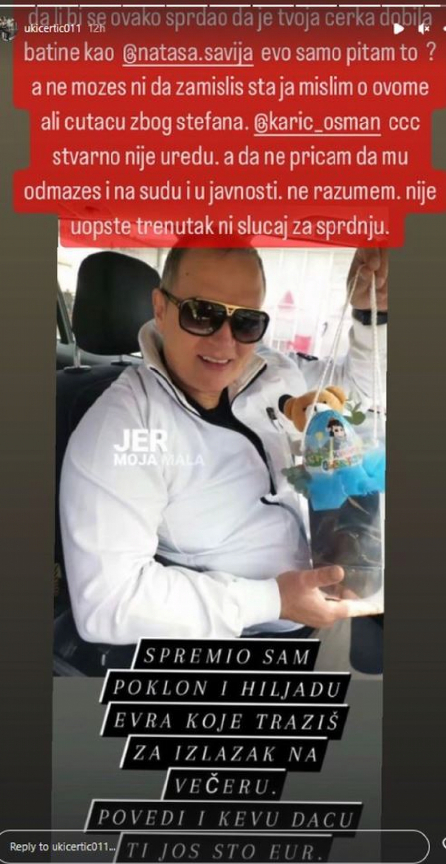 -Spremio sam poklon i hiljadu evra koje tražiš za izlazak na večeru. Povedi i kevu, daću ti još sto evra - napisao je Osman uz fotografiju na kojoj nasmejan pozira.