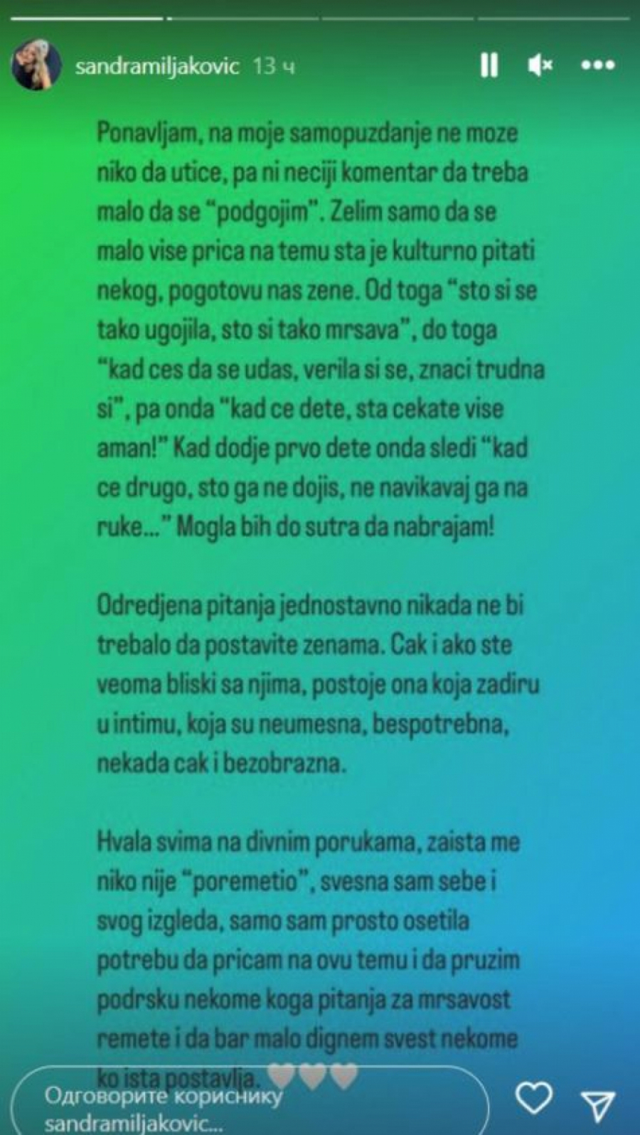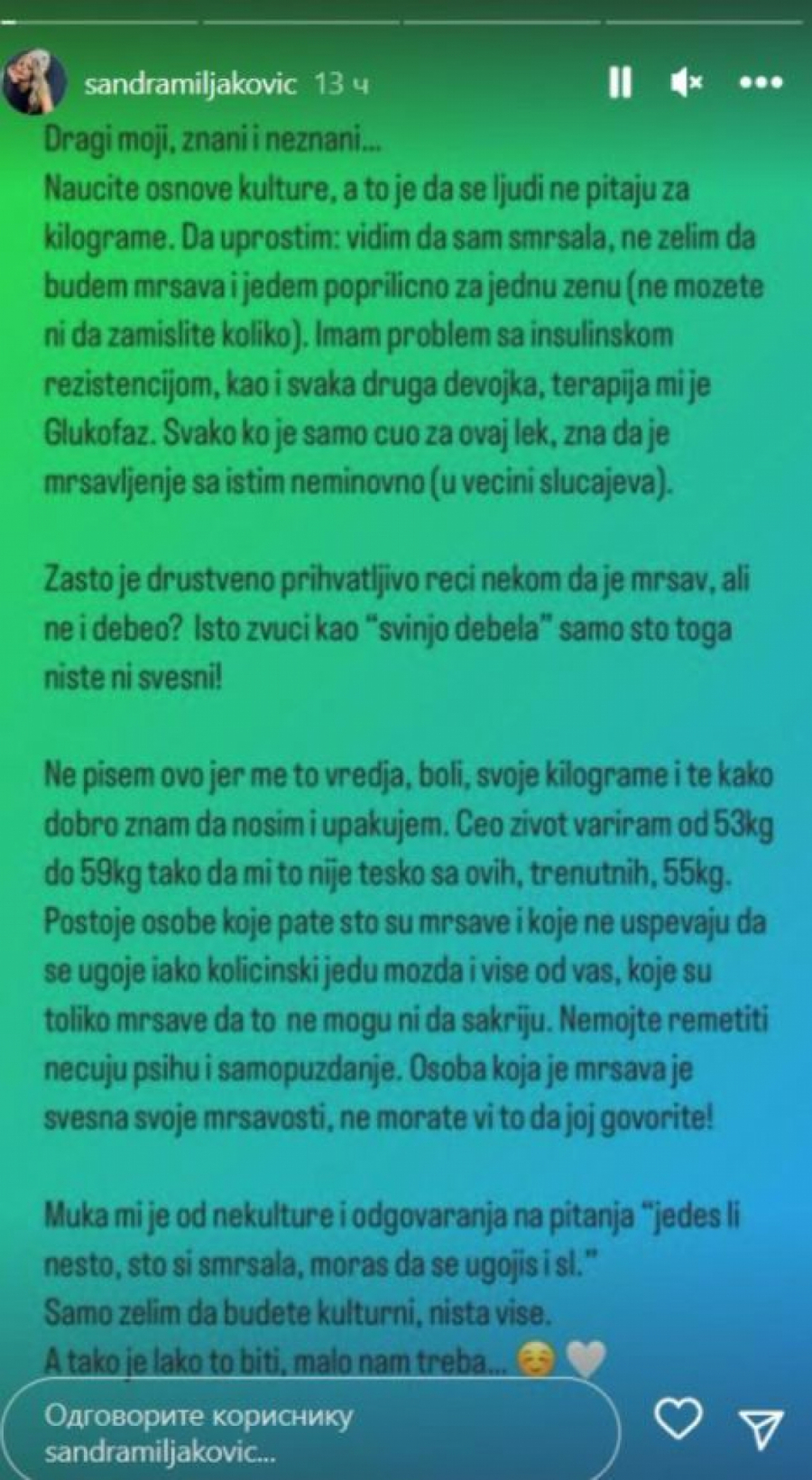 -Dragi moji znani i neznani, naučite osnove kulture, a to je da se ljudi ne pitaju za kilograme. Da uprostim: Vidim da sam smršala, ne želim da budem mršava i jedem porprilično za jednu ženu (ne možete da zamislite koliko). Imam problem sa insulinskom rezistencijom, kao i svaka druga devojka. Svako ko je samo čuo za ovaj lek, zna da je mršavljenje sa istim neminovno (u većini slučajeva). Zašto je društveno prihvatljivo reći nekome da je mršav, ali ne i debeo? Isto zvuči kao "svinjo debela", samo toga niste svesni - započela je Sandra.