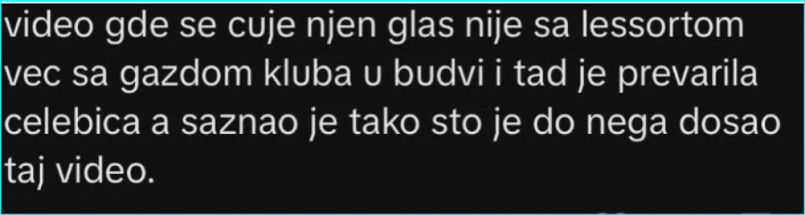 - Video gde se čuje njen glas nije sa Lesorom, već sa gazdom kluba u Budvi i tad je prevarila Čelebića, a saznao je tako što je do njega došao taj video - glasio je komentar ispod videa na TikToku.
