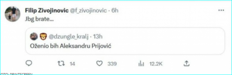 Filip Živojinović reagovao je na komentar jednog od tviteraša na popularnoj druđtvenoj mreži, koji je napisao "da bi rado oženio njegovu ženu Aleksandru Prijović".
