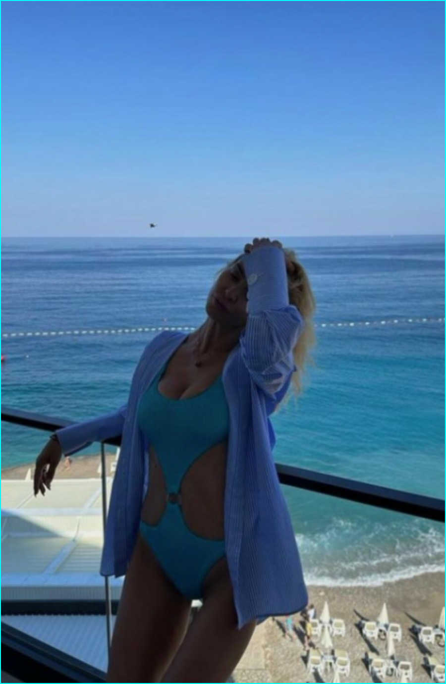 Golmanova supruga je zaigrala na kartu provokacije, pa se snimala u toplesu, a grudi je prekrila rukama. Zadnjicu je istakla u minijaturnom donjem delu kupaćeg kostima, a na glavi je imala šešir.
