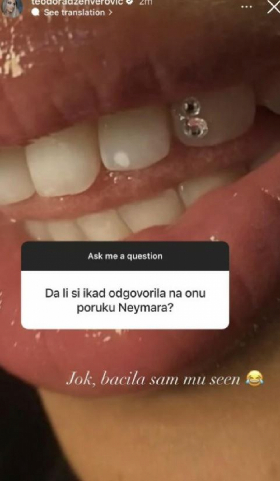 Podsetimo, Džehverovićeva se pohvalila se pratiocima na Instagramu da joj je poslao poruku poznati fudbaler Nejmar. Ona je okačila Instagram stori na kojem je stajala poruka od Nejmara sa emotikonom "aplauza" , a ona je nakon toga ostala šokirana.