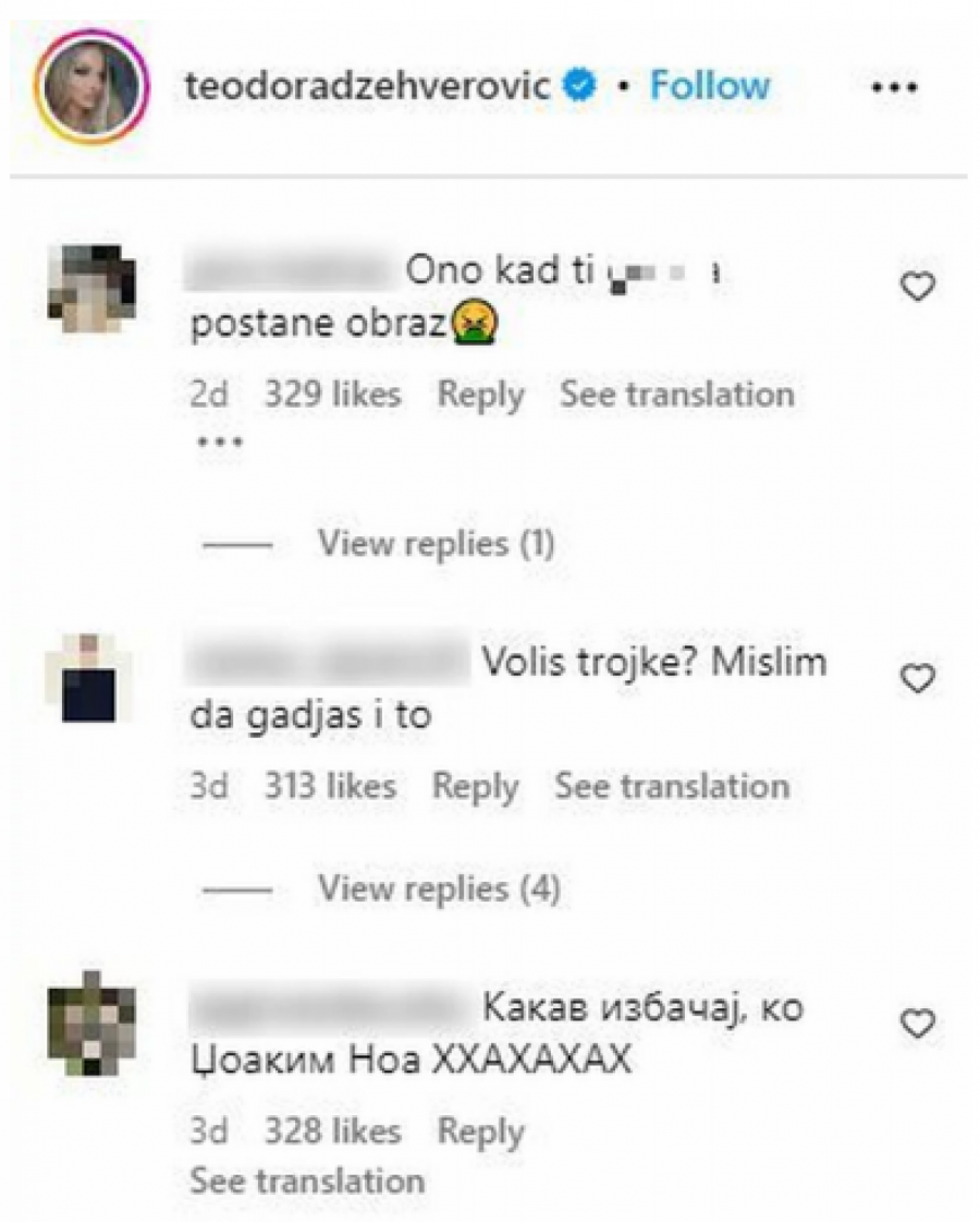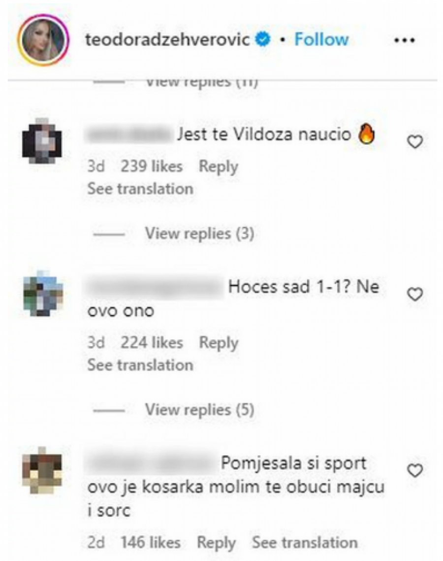 Teodora Džehverović, koju već mesecima unazad spajaju sa košarkašima Maticom Rebecom i Lukom Vildozom, podelila je na društvenim mrežama niz objava koje su šokirale mnoge.