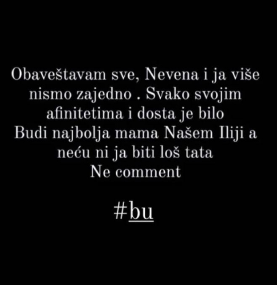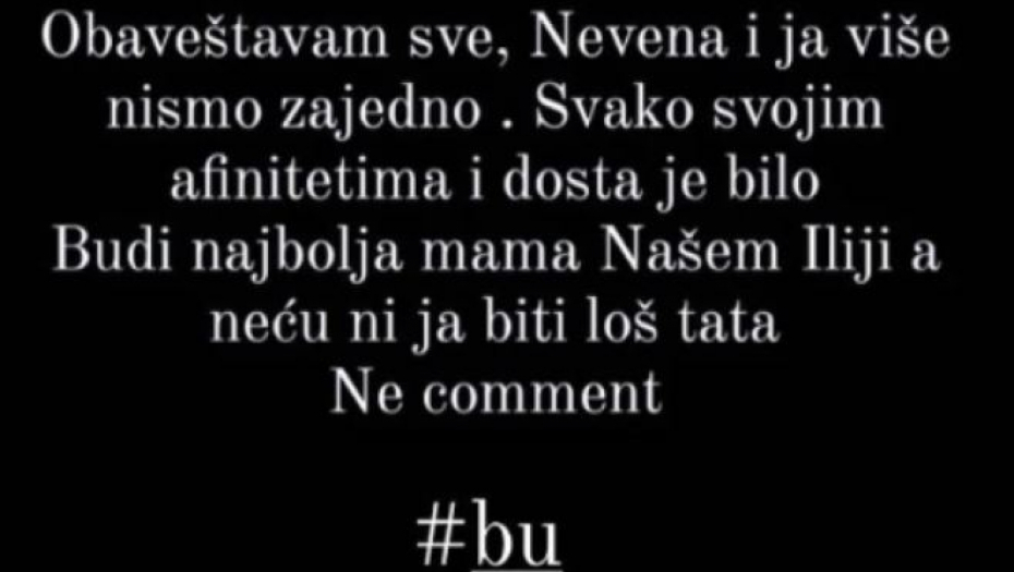 - Obaveštavam sve, Nevena i ja više nismo zajedno. Svako svojim afinitetima i dosta je bilo. Budi najbolja mama našem Iliji, a neću ni ja biti loš tata. Bez komentara - napisao je glumac.