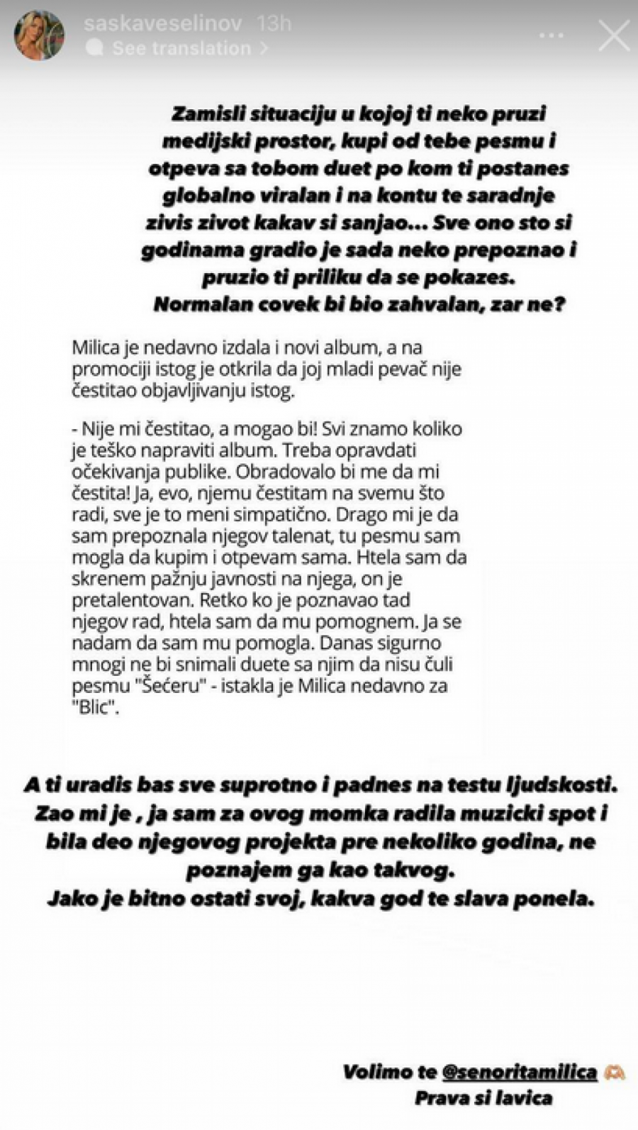-Zamisli situaciju u kojoj ti neko pruži medijski prostor, kupi od tebe pesmu i otpeva sa tobom duet po kom ti postaneš globalno viralan i na kontu te saradnje živiš život koji si sanjao. Sve ono što si godinama gradio je sada neko prepoznao i pružio ti priliku da se pokažeš. Normalan čovek bi bio zahvalan, zar ne? A ti uradiš potpuno suprotno i padneš na testu ljudskosti. Žao mi je, ja sam za ovog momka radila muzički spot i bila deo njegovog projekta pre nekoliko godina, ne poznajem ga kao takvog. Jako je bitno ostati svoj, kakva god te slava ponela. Volimo te Milice, prava si lavica- napisala je Saška na društvenim mrežama.
