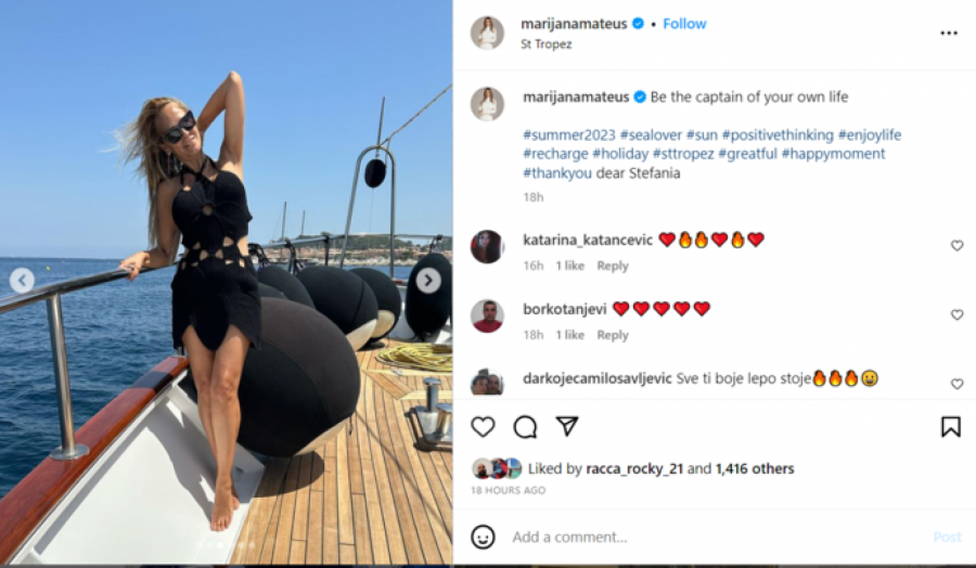Marijana Mateus letuje u Sen Tropeu, omiljenom mestu slavnih ličnosti, a svojim izgledom ostavlja bez daha. Naime, vrele letnje dane provodi na jahti na kojoj je pozirala u rupičastoj crnoj haljini sa prorezima na struku.