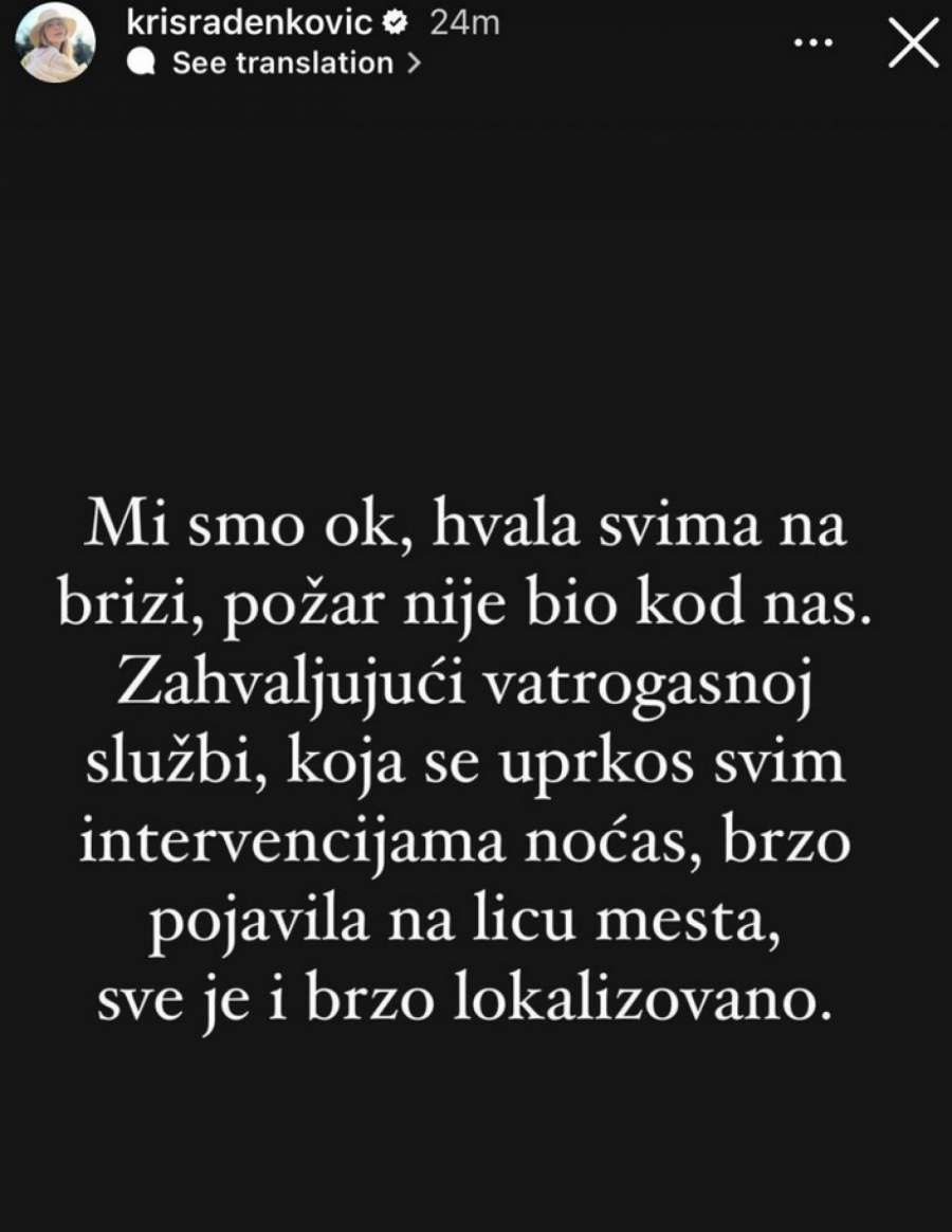 -Mi smo ok, hvala svima na brizi, požar nije bio kod nas. Zahvaljujući vatrogasnoj službi, koja se uprkos svim intervencijama noćas, brzo pojavila na licu mesta, sve je brzo lokalizovano - dodala je voditeljka RTS-a