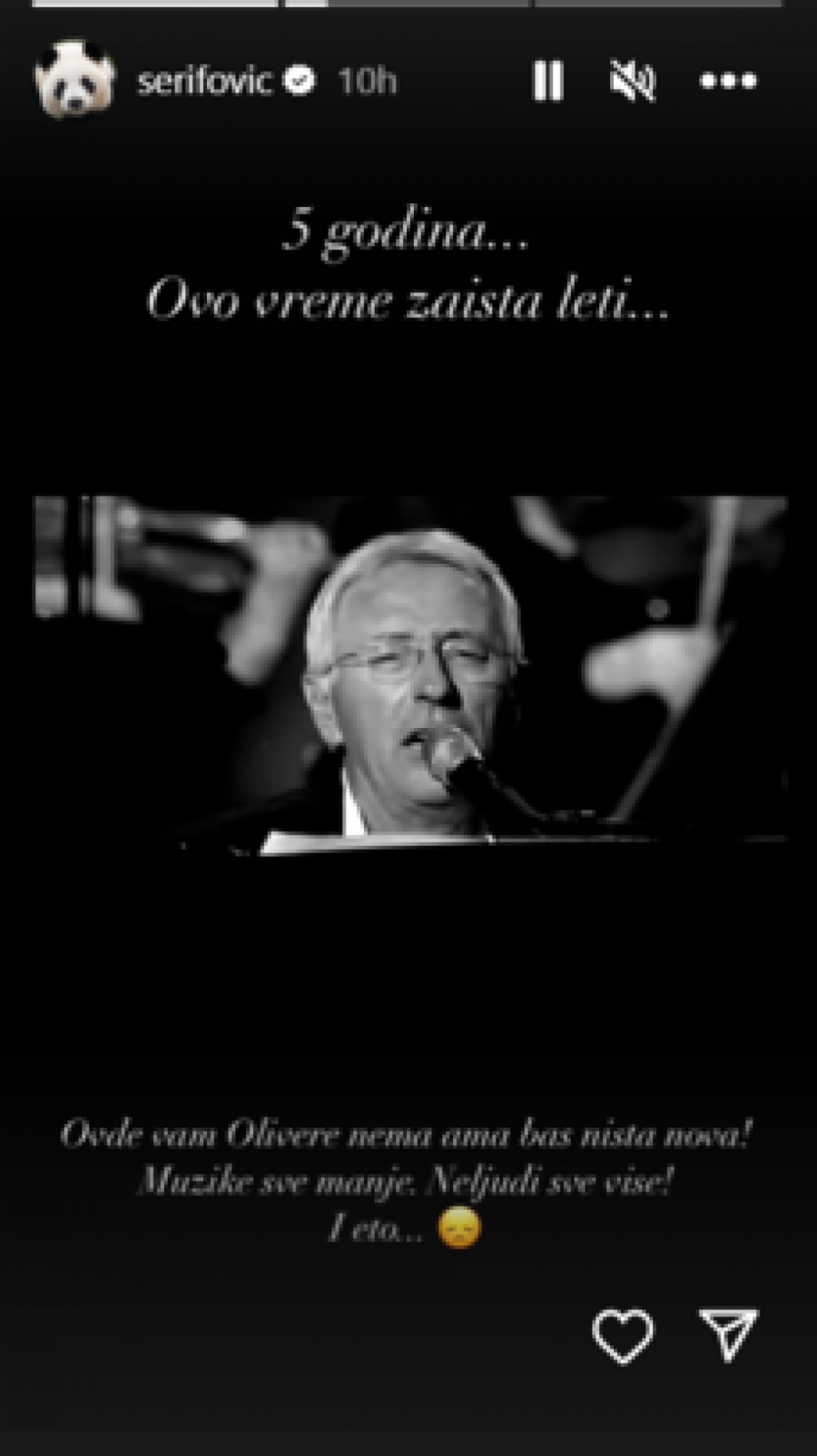 - Pet godina... Ovo vreme zaista leti... Ovde nam, Olivere, nema ama baš ništa nova! Muzike sve manje. Neljudi sve više! I eto - napisala je Marija Šerifović uz tužni emotikon i tako odala počast Oliveru čije numere redovno izvodi na svojim koncertima i jako voli poštuje njegov rad i delo koje je za života ostavio da traju.