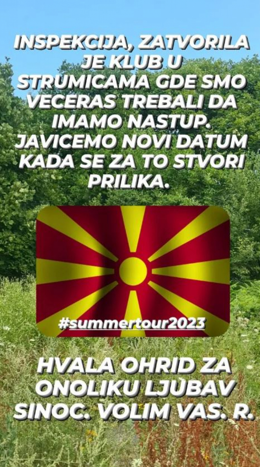 – Inspekcija, zatvorila je klub u Strumicama gde smo večeras trebali da imamo nastup. Javićemo novi datum kada se za to stvori prilika – napisao je Rasta na svom Instagram storiju.