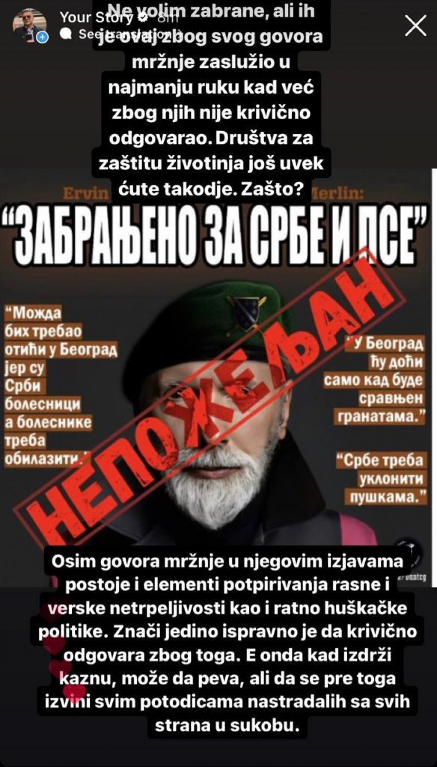 „Ne volim zabrane, ali je ovaj zbog svog govora mržnje zaslužio u najmanju ruku kad već zbog njih nije krivično odgovarao. Društva za zašititu životinja još uvek ćute takođe. Zašto?", napisao je Mirković na svom Instagram nalogu.