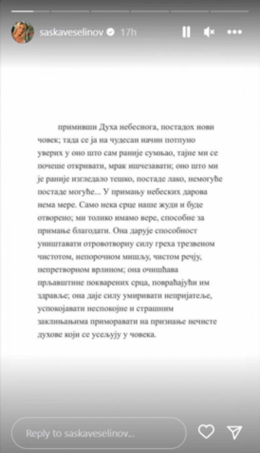 Nadahnuta mirom koji donosi svaka poseta bilo kom pravoslavnom hramu, Saška je sa pratiocima najpre podelila tekst koji objašnjava snagu vere i sve blagodeti koje ona nosi, a potom se dogodilo pravo čudo. Naime, u crkvu je za Saškom ušetao golub, a svima je poznato koliko je ona vezana za ptice.