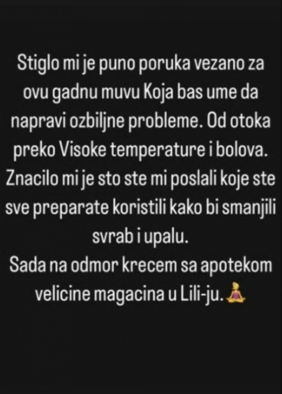 - Stiglo mi je puno poruka vezano za ovu gadnu mucu, koja baš ume da napravi ozbiljne probleme. Od otoka, preko visoke temperature i bolova. Značilo mi je što ste mi poslali koje ste preparate koristili kako bi smanjili svrab i upalu. Sada na odmor krećem sa apotekom veličine magacina - podelila je sa svima Pajićeva.
