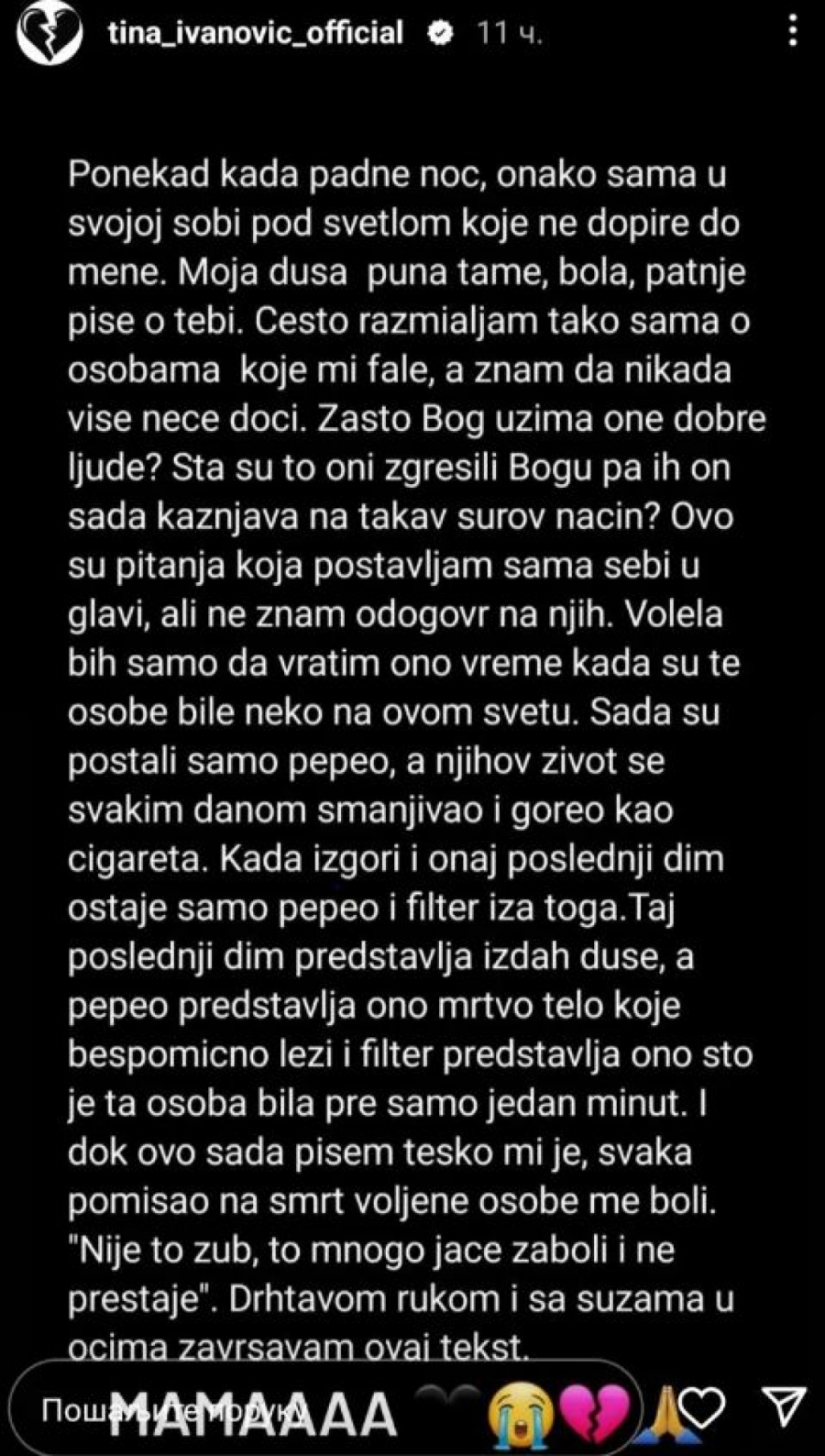 Njena smrt duboko je pogodila pevačicu koja danima ne može da se pomiri sa majčinim odlaskom. U prilog tome svedoči i Tinina današnja objava koja je rasplakala sve na društvenim mrežama, a koju prenosimo u celosti.