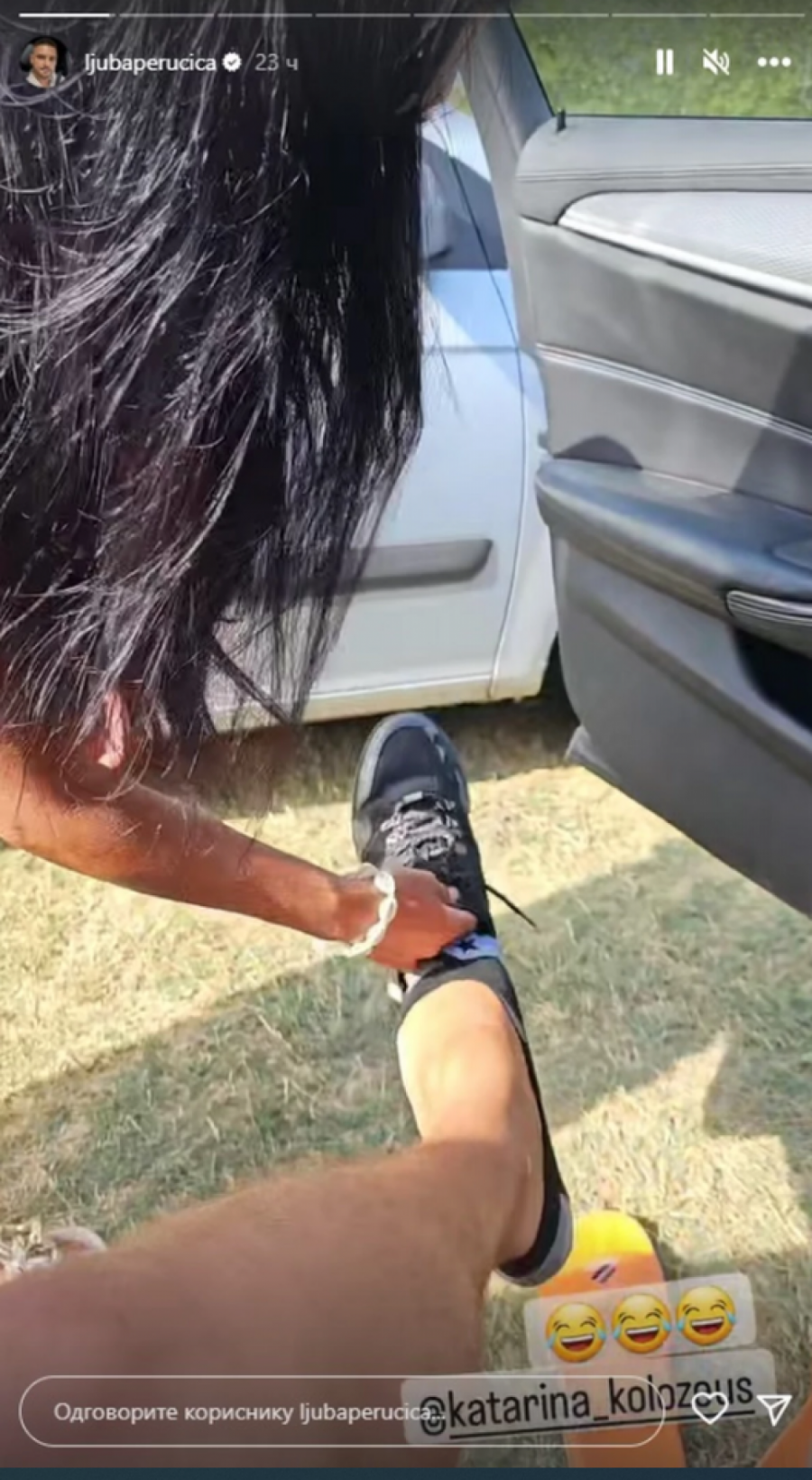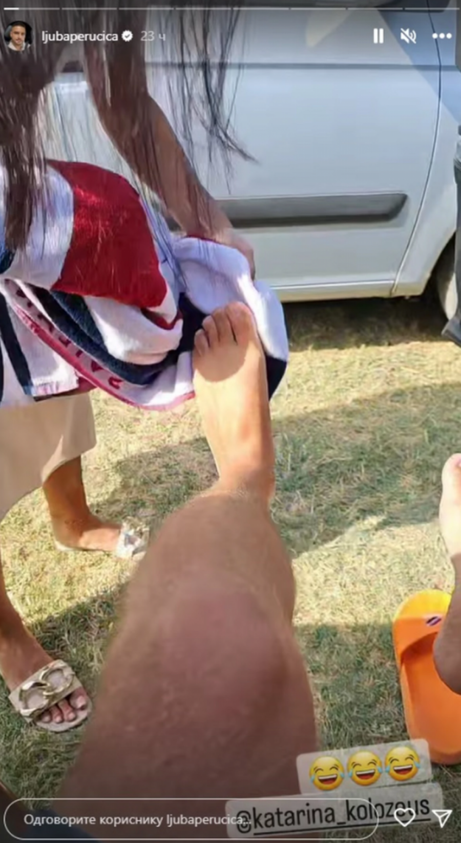 Na videu je pevač pokazao kako sedi u kolima dok mu Katarina briše noge od peska i obuva mu čarape, a zatim i patike.