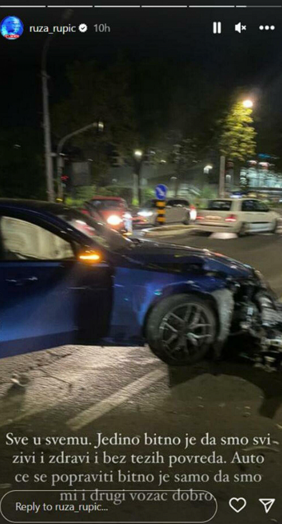 - Dakle, što se tiče udesa, istina je da smo momak i ja imali udes. Sva sreća niko nema teže povrede i u redu smo. Bili smo oboje u urgentnom, uradili sva snimanja, sve nalaze i sve je u redu. Hvala vam na porukama podrške i izvinite što smo vas zabrinuli večeras - napisala je Ruža u svojoj objavi, pa dodala: