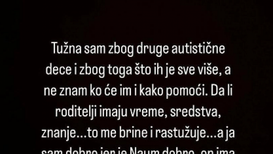 - Tužna sam zbog druge autistične dece i zbog toga što ih je sve više, a ne znam ko će im i kako pomoći. Da li roditelji imaju vremena, sredstava, znanje... To me brine i rastužuje... A ja sam dobro jer je Naum dobro, on ima sve što mu treba, srećan je pa sam i ja srećna sa njim - otkrila je Jelena Radanović.