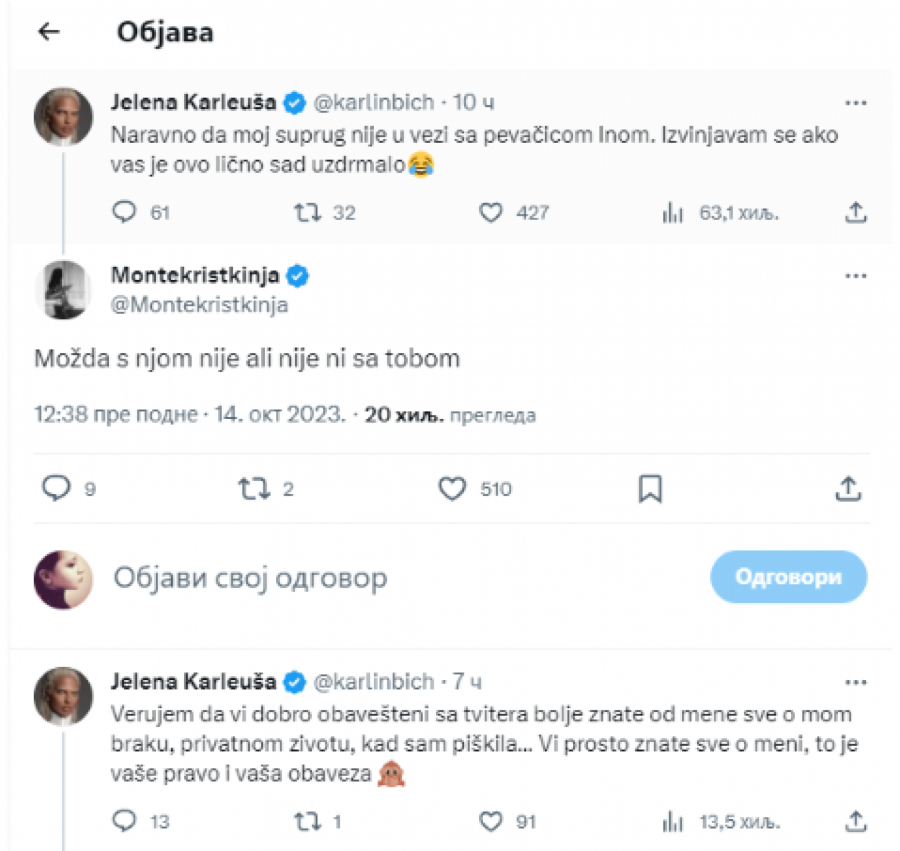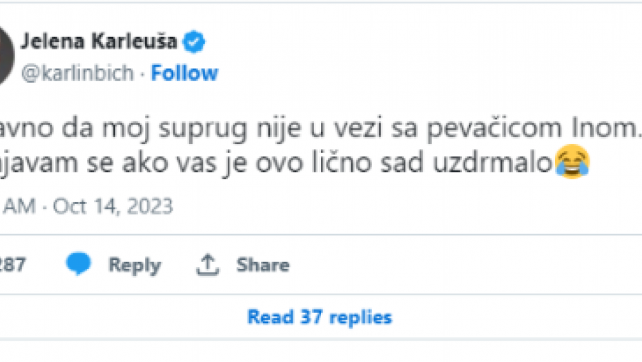 - Naravno da moj suprug nije u vezi sa pevačicom Inom. Izvinjavam se ako vas je ovo sad lično uzdrmalo - napisala je Jelena.