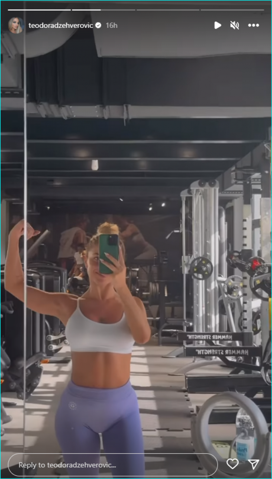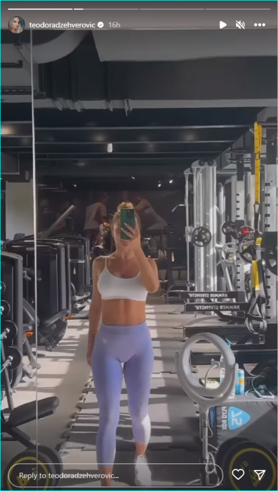 Pevačica Teodora Džehverović često na svom Instagram profilu pokazuje na koji način održava svoju vitku liniju. Ona u poslednje vreme ima česte treninge, a posle skoro svakog odrađenog svojim pratiocima se pohvali rezultatima.