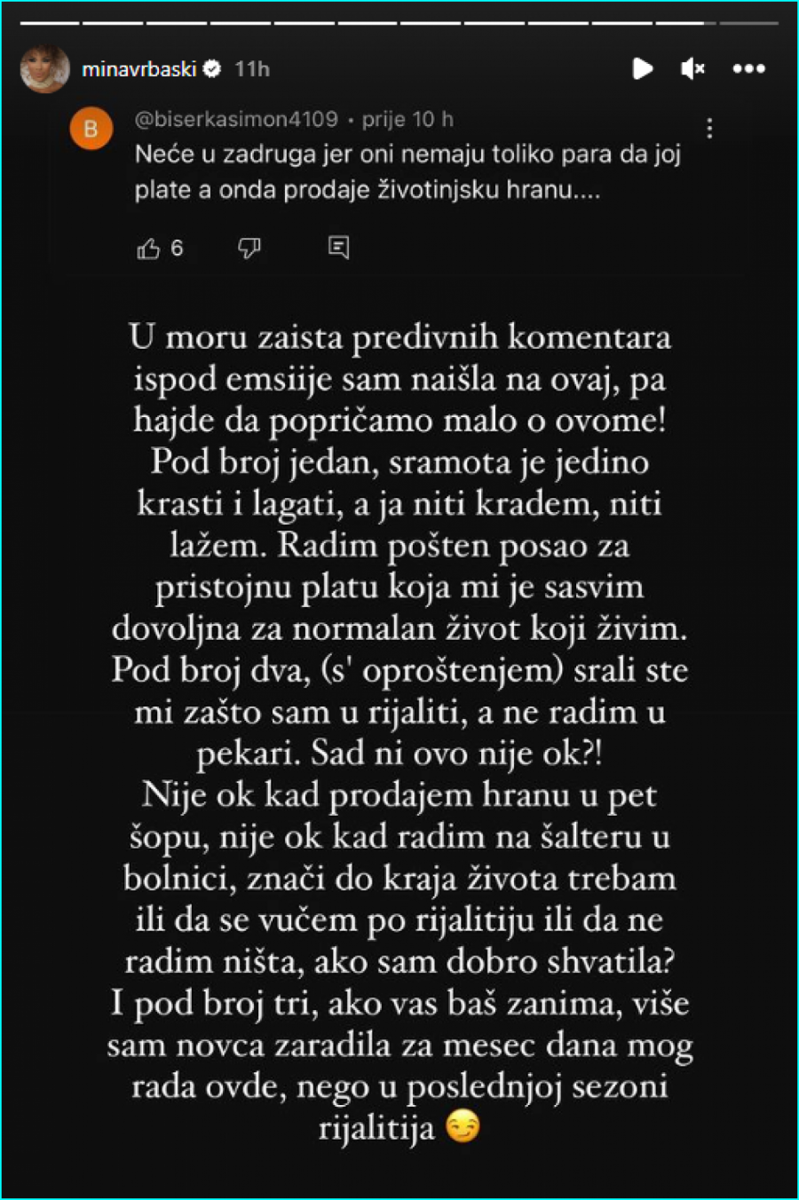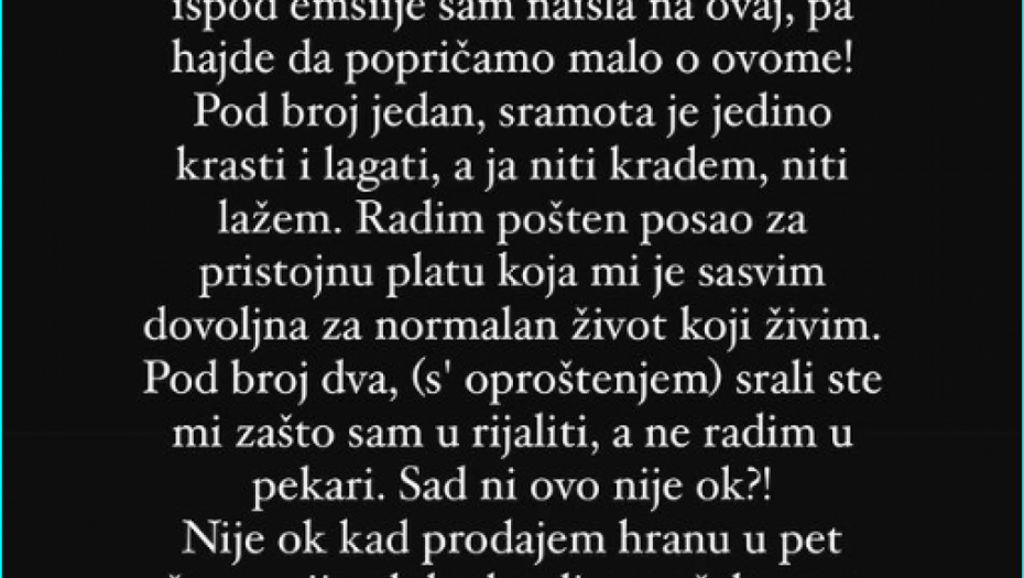 - U moru zaista predivnih komentara ispod emisije sam naišla na ovaj, pa hajde da popričamo malo o ovome! Pod broj jedan sramota je jedino krasti i lagati, a ja niti kradem, niti lažem. Radim pošten posao za pristojnu platu koja mi je sasvim dovoljna za normalan život koji živim. Pod broj dva, s*ali ste mi zašto sam u rijalitiju, a ne radim u pekari. Sad ni ovo nije ok?! Nije ok kad prodajem hranu u pet šopu, nije ok kad radim na šalteru u bolnici, znači do kraja života trebam ili da se vučem po rijalitiju i ne radim ništa, ako sam dobro shvatila? - poručila je Mina, zatim otkrila sve o zaradi: