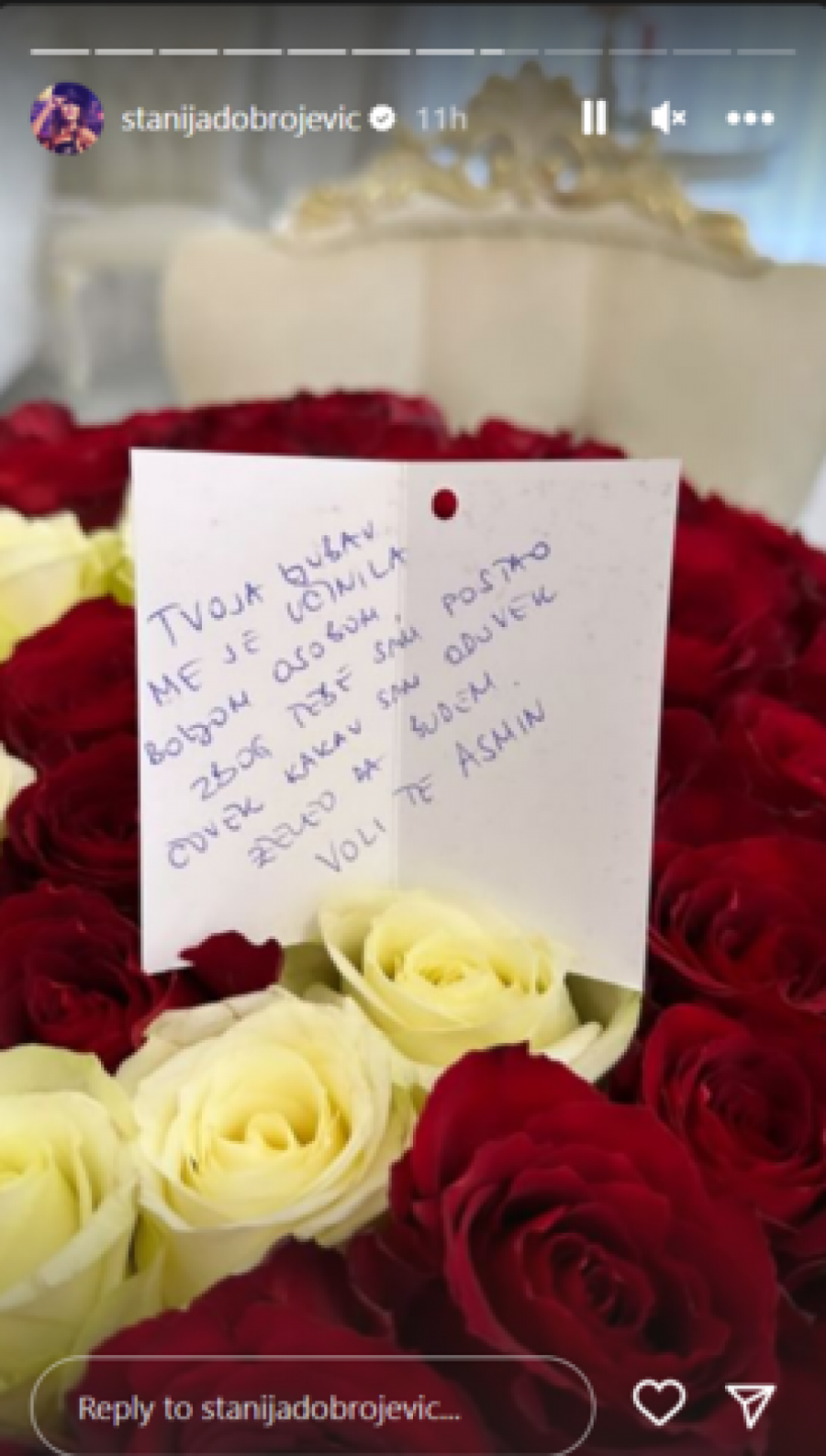 - Tvoja ljubav me je učinila boljom osobom, zbog tebe sam postao čovek kakav sam uvek hteo da budem. Voli te Asmin - pisalo je na poruci u buketu prelepih ruža koje je Stanija dobila od Asmina, a nije oklevala, pa je uredno postavila fotke buketa na Instagram.