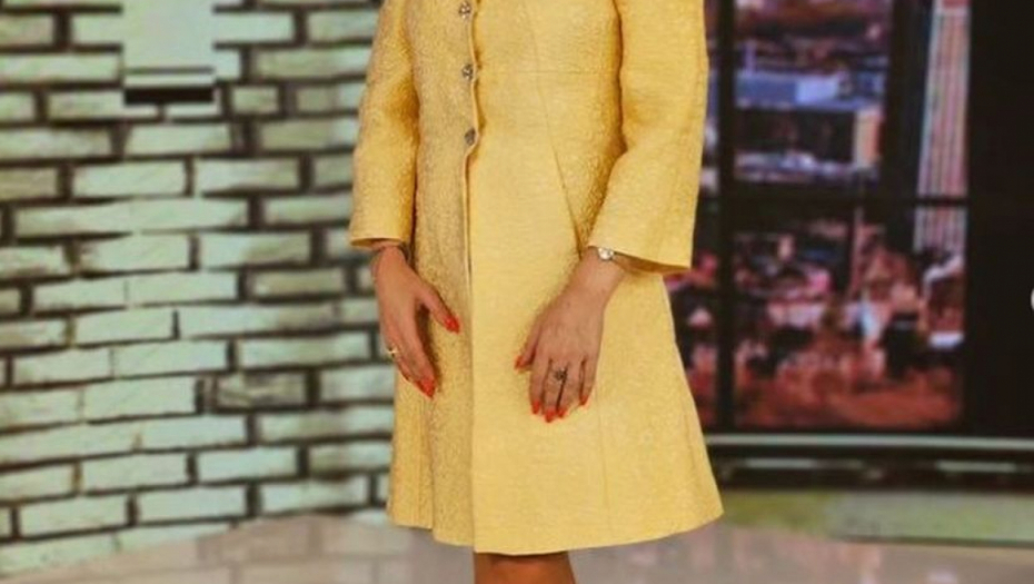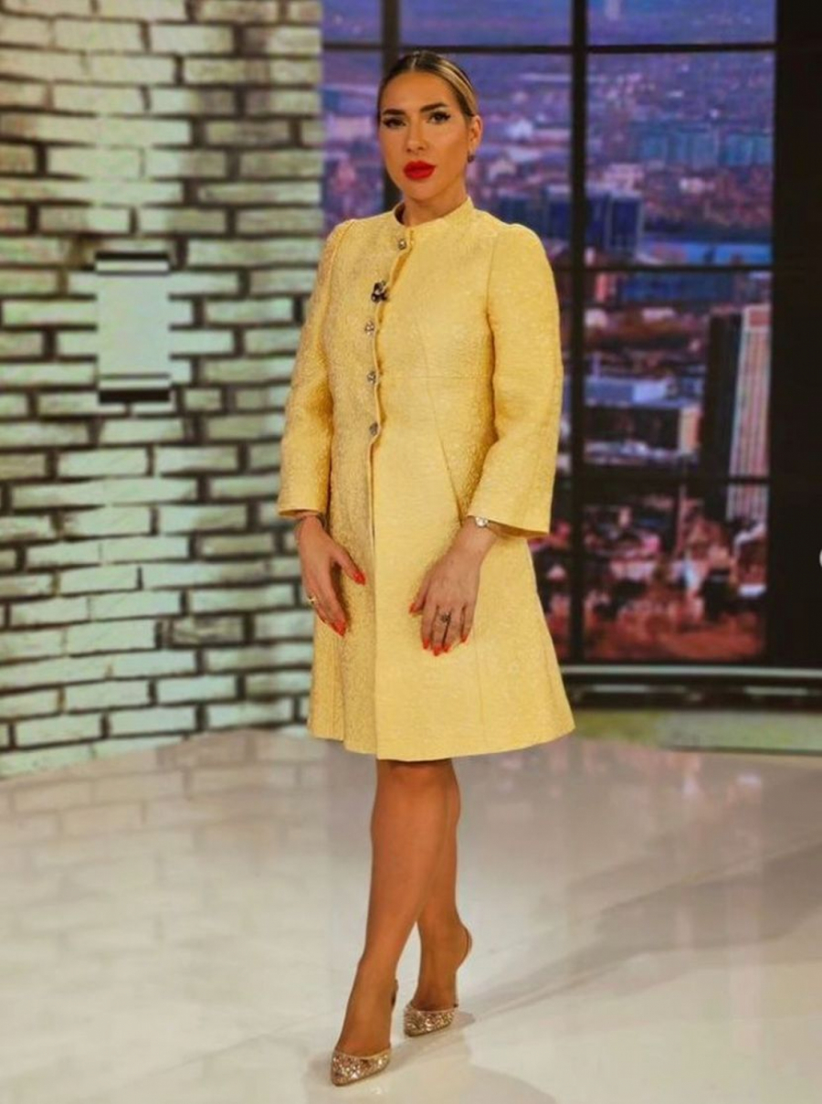Za razliku od jučerašnjeg, šljaštećeg kombinezona u kojem joj je slučajno sevnula i dojka, danas je Jovana svedena od glave do kolena u žutoj damskoj haljini od tvida.