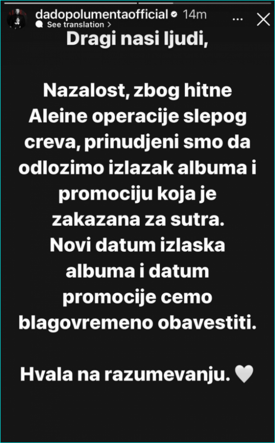 - Dragi naši ljudi, nažalost, zbog hitne Aleine operacije slepog creva, prinuđeni smo da odložimo izlazak albuma i promociju koja je zakazana za sutra - napisao je na Instagramu Dado, spomenuvši ćerkicu.