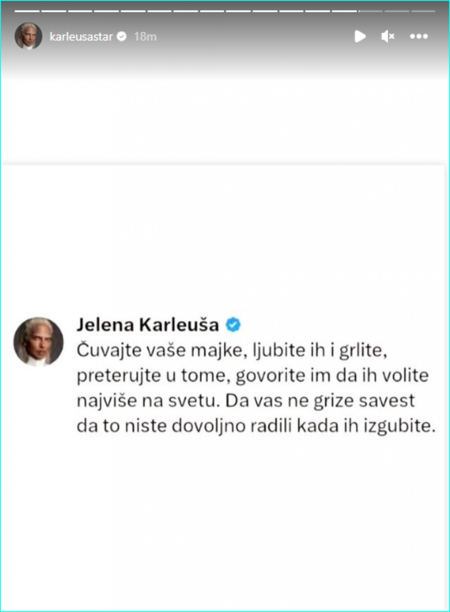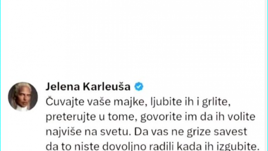 - Čuvajte vaše majke, ljubite ih i grlite, preterujte u tome. Govorite im da ih volite najviše na svetu, da vas ne grize savest da to niste dovoljno radili kada ih izgubite - napisala je Karleuša.