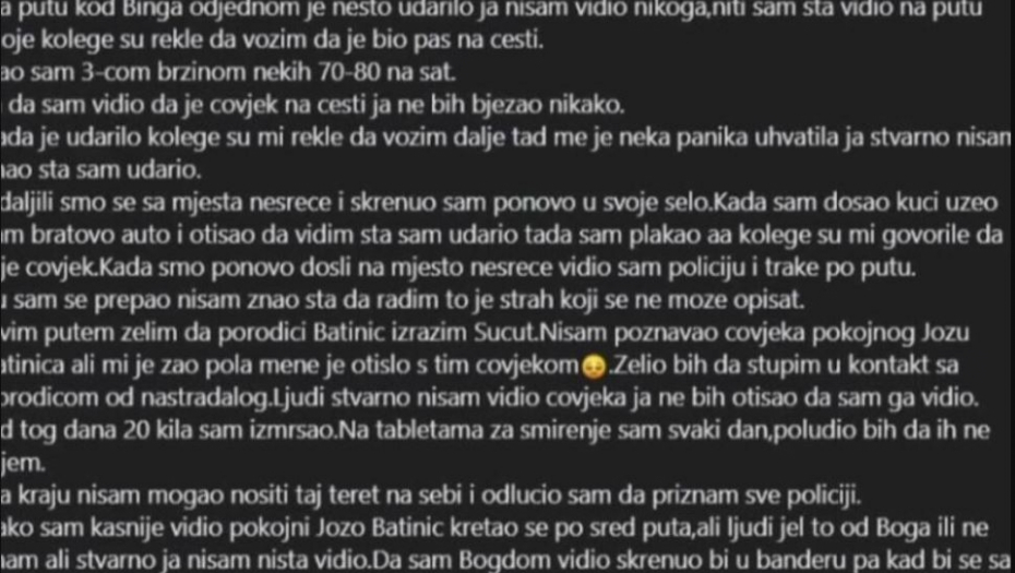 - Udaljili smo se sa mesta nesreće i skrenuo sam ponovo u svoje selo. Kada sam došao kući, uzeo sam bratov auto i otišao da vidim šta sam udario. Tada sam plakao, a kolege su mi govorile da nije čovek. Kada smo ponovo došli na mesto nesreće, video sam policiju i trake po putu. Tu sam se prepao i nisam znao šta da radim, to je strah koji se ne može opisati. Ovim putem želim da porodici Batinić izrazim saučešće. Nisam poznavao čoveka, pokojnog Jozu B, ali mi je žao, pola mene je otislo s tim čovekom - naveo je pevač i dodao: