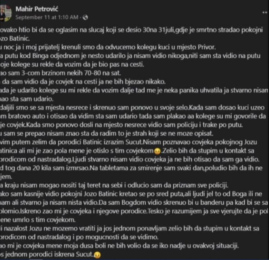 - Kako sam kasnije video, pokojni Jozo B. se kretao posred puta, ali ljudi, je li to od Boga ili ne znam, ali stvarno nisam ništa video. Da sam video, skrenuo bih u banderu, pa bih se sav polomio. Iskreno, žao mi je čoveka i njegove porodice. Teško je, razumem sve. Verujte da je pola mene umrlo s tim čovekom. Nažalost, Jozu ne možemo vratiti, ali bih želeo da se vidim sa njegovom porodicom. Žao mi je čoveka, mene moja duša boli i ne bih voleo da se bilo ko nađe u ovakvoj situaciji - napisao je Petrović na svom Fejsbuku.