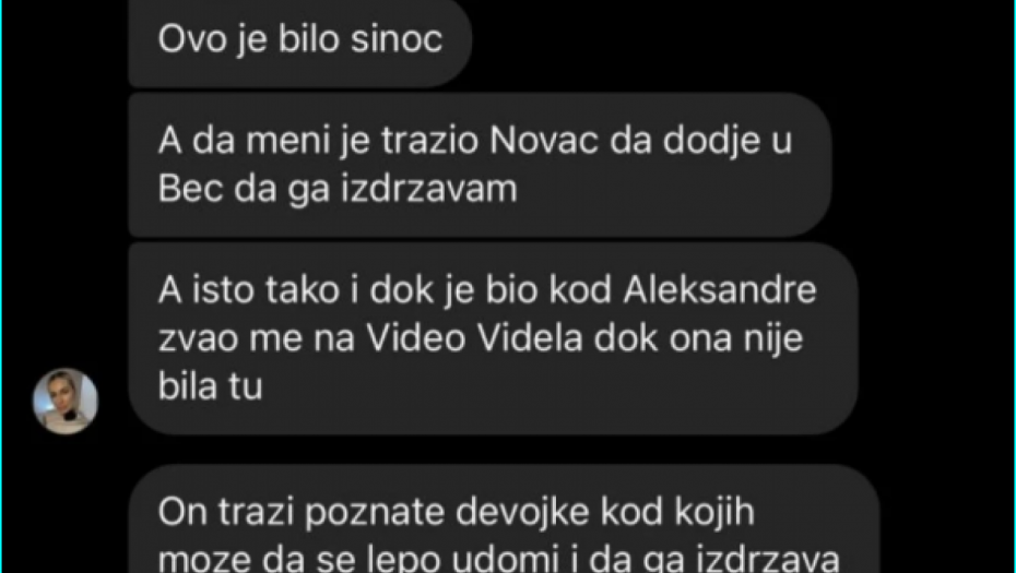 - Meni je tražio novac da dođem u Beč, da ga izdržavam. A isto tako dok je bio sa Aleksandrom, zvao me je na video-poziv, dok ona nije bila tu - napisala je Jelena.