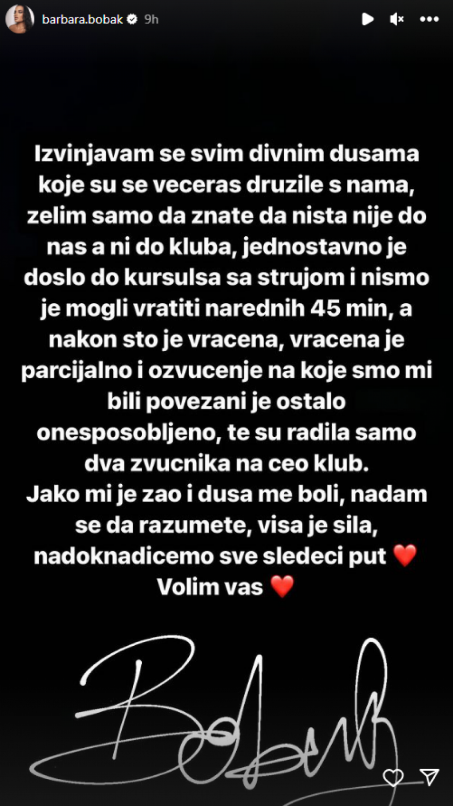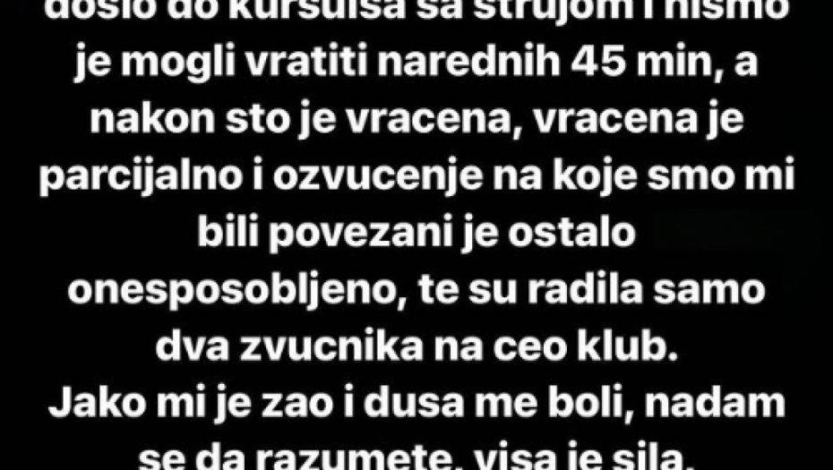 - Izvinjavam se svim divnim dušama koje su se večeras družile sa nama. Želim samo da znate da ništa nije do nas, a ni do kluba, jednostavno je došlo do kuršlusa sa strujom i nismo je mogli vratiti 45 minuta, a nakon što je vraćena, vraćena je parcijalno i ozvučenje na koje smo mi bili povezani je ostalo onesposobljeno, te su radila samo dva zvučnika na ceo klub. Jako mi je žao i duša me boli, nadam se da razumete, viša je sila. Nadoknadićemo sve sledeći put. Volim vas - napisala je pevačica putem svog profila na društvenioj mreži Instagram.