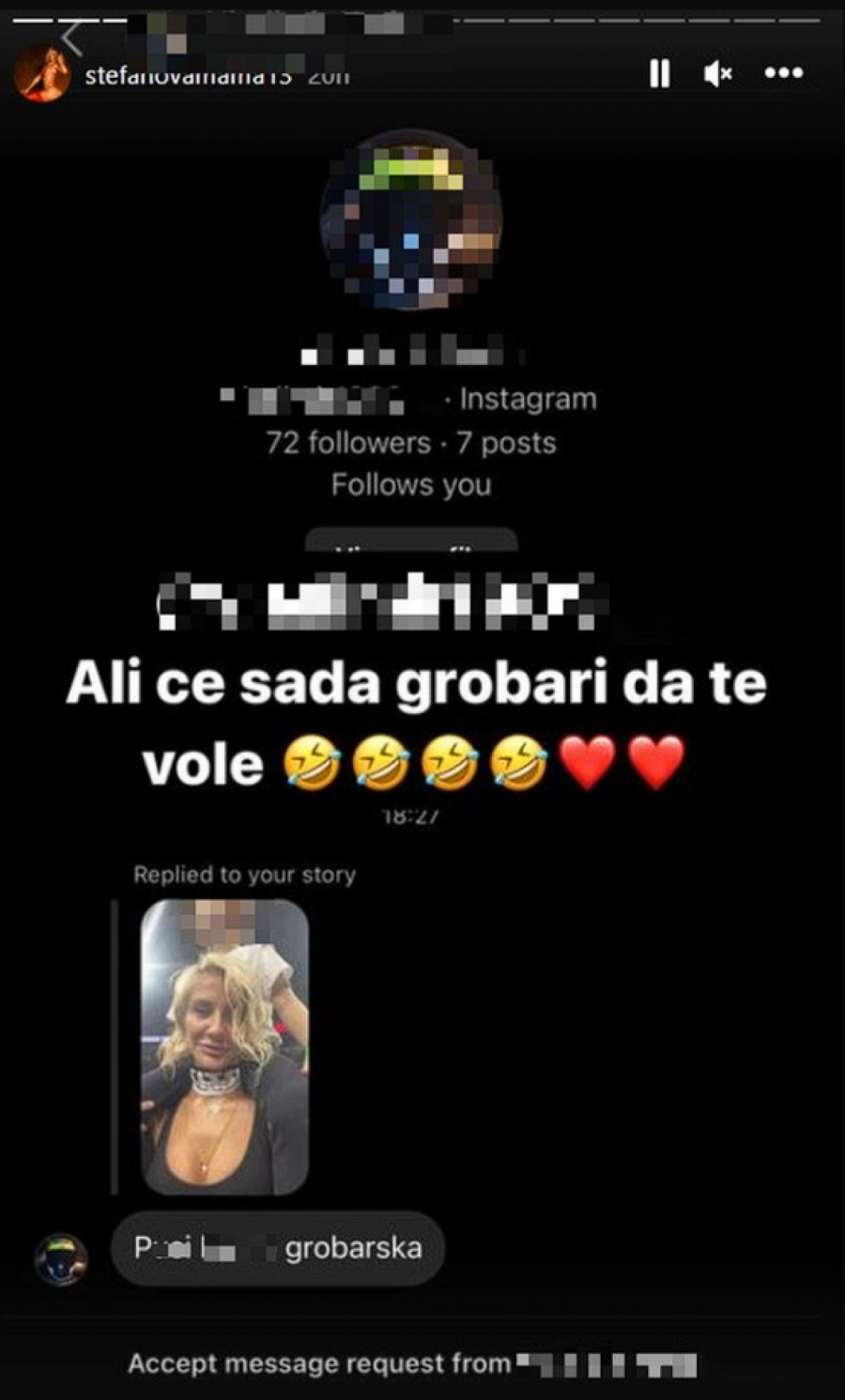 Zbog snimaka i fotografija koje je objavljivala, putem Instagrama je dobila i uvredljivu poruku navijača suparničkog tima, što je takođe objavila.
