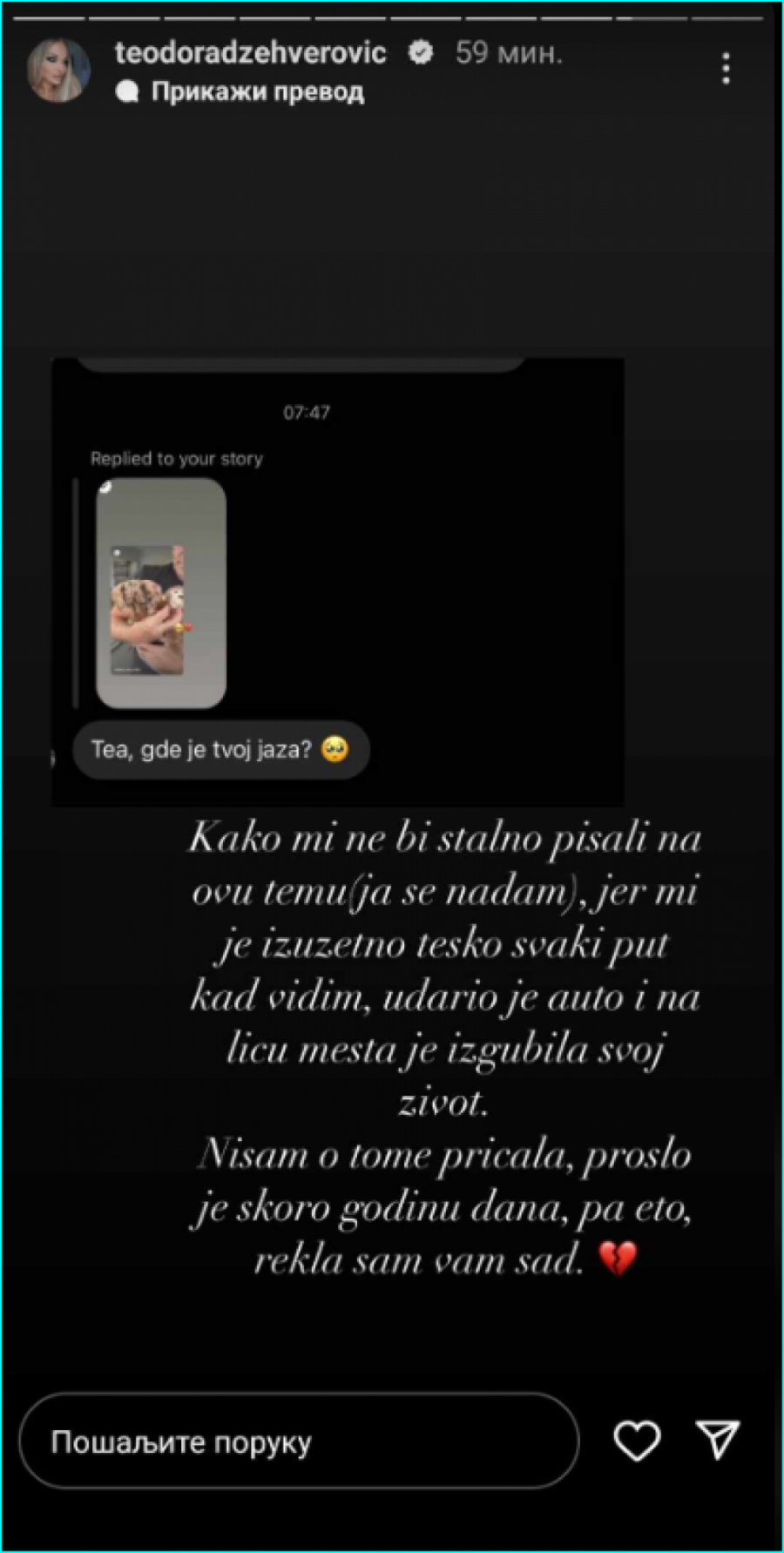 - Nisam o tome pričala, prošlo je skoro godinu dana. Eto, rekla sam vam sad - napisala je Teodora.