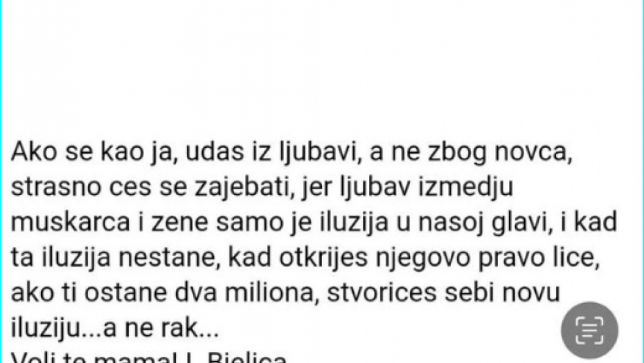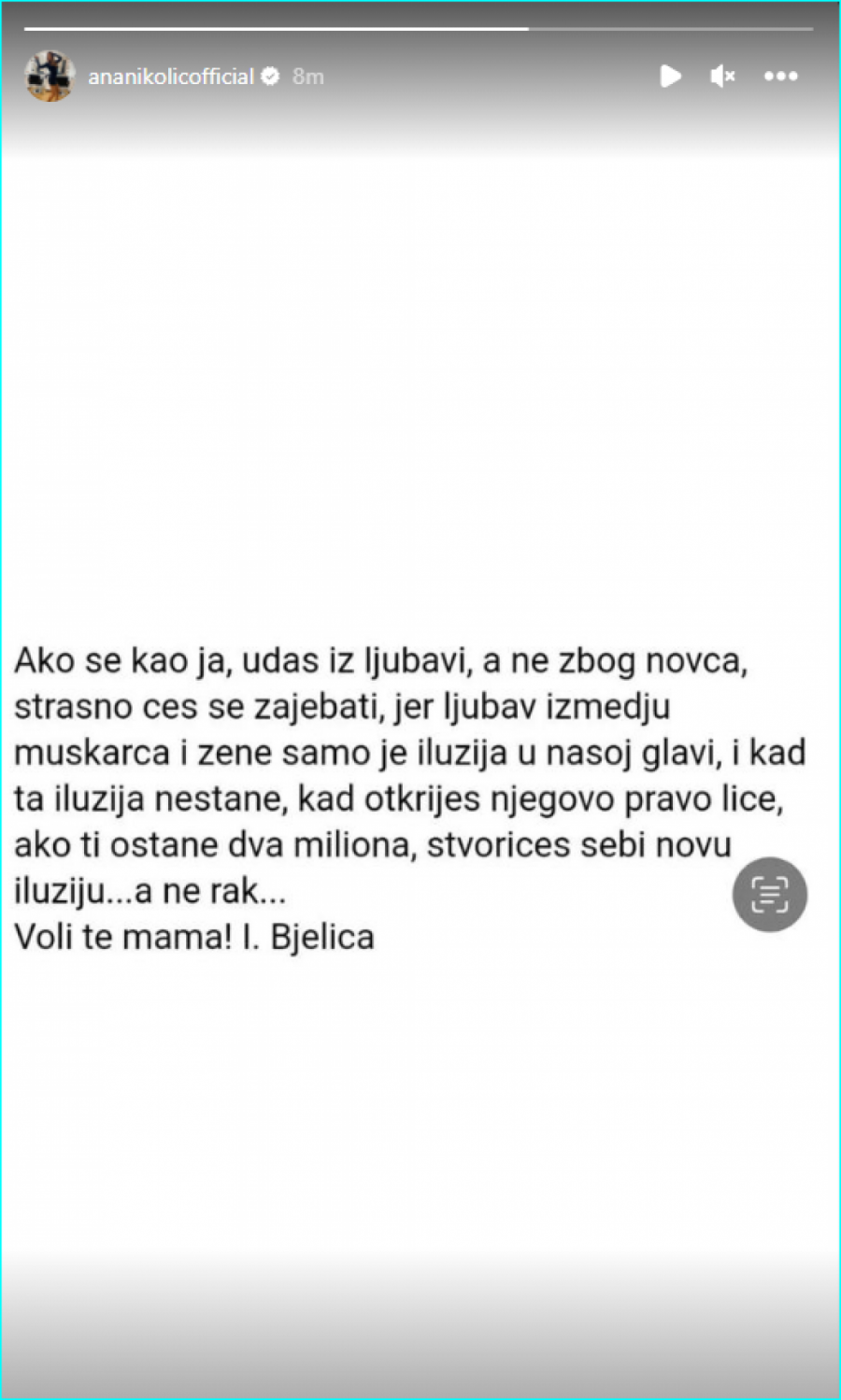 - Ako se kao ja, udaš iz ljubavi, a ne zbog novca, strašno ćeš se za*ebati, jer ljubav između muškarca i žene samo je iluzija u našoj glavi. Kad ta iluzija nestane, kad otkriješ njegovo pravo lice, ako ti ostane dva miliona, stvorićeš sebi novu iluziju, a ne rak - objavila je Nikolićeva na svom Instagram profilu.